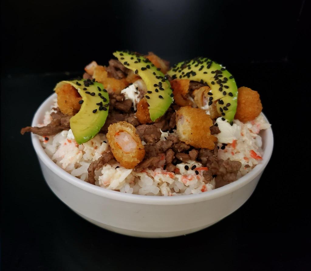 Arroz blanco, philadelphia, tampico, camarón empanizado, res, aguacate y ajonjolí.