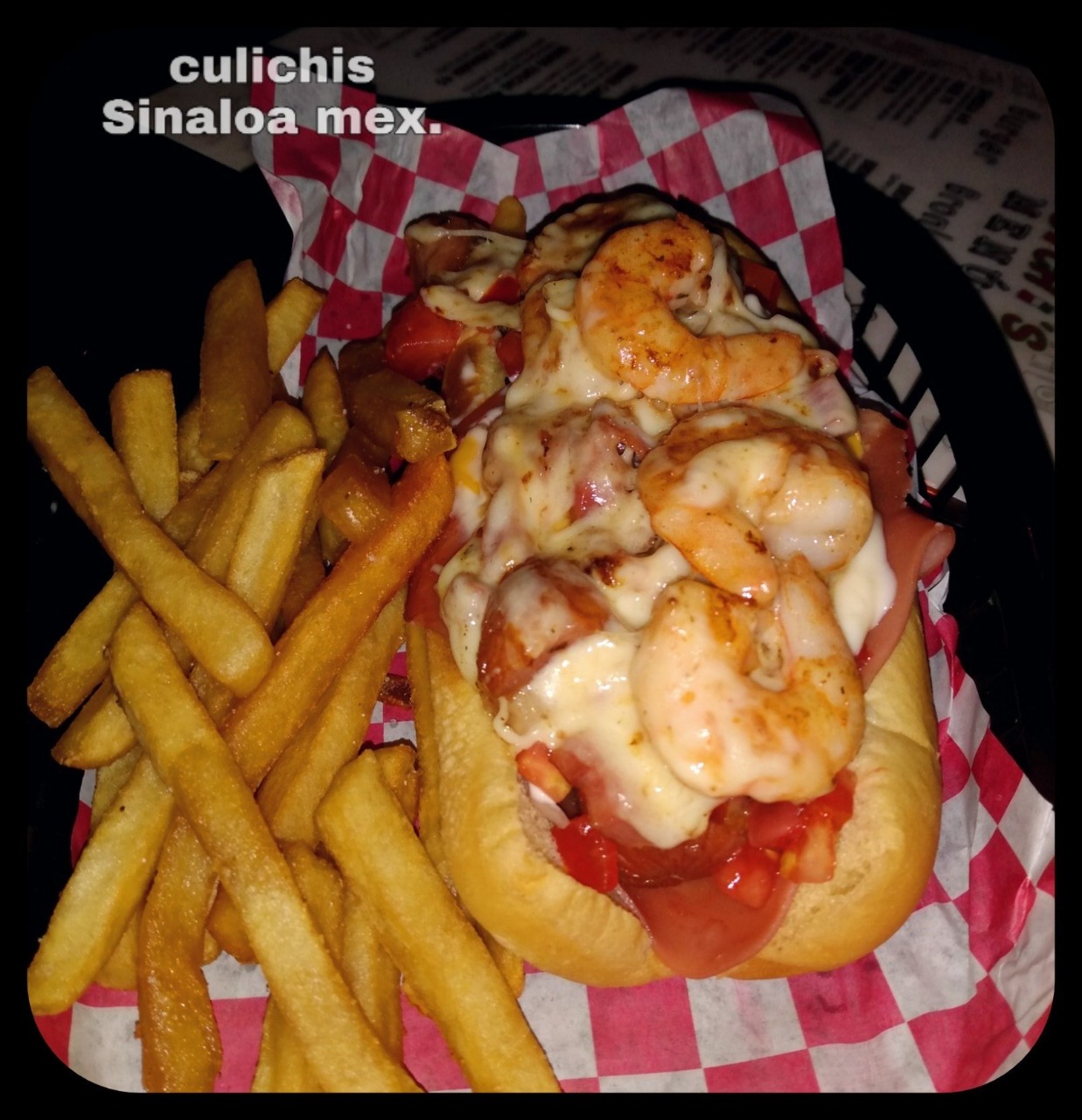 Salchicha envuelta en tocino, jamon, queso americano, topping de chihuahua, trocitos de tocino y camaron, con papas a la francesa