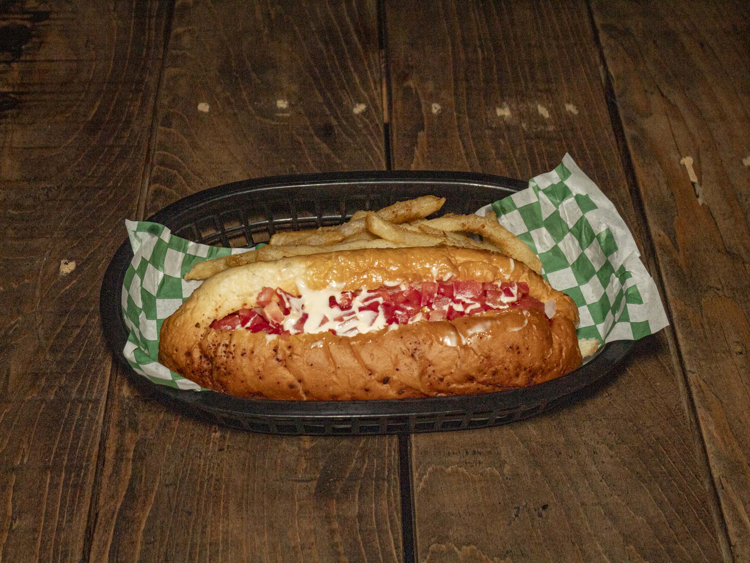 Salchicha de pavo envuelta en tocino, tomate, cebolla y mayonesa incluye papas.