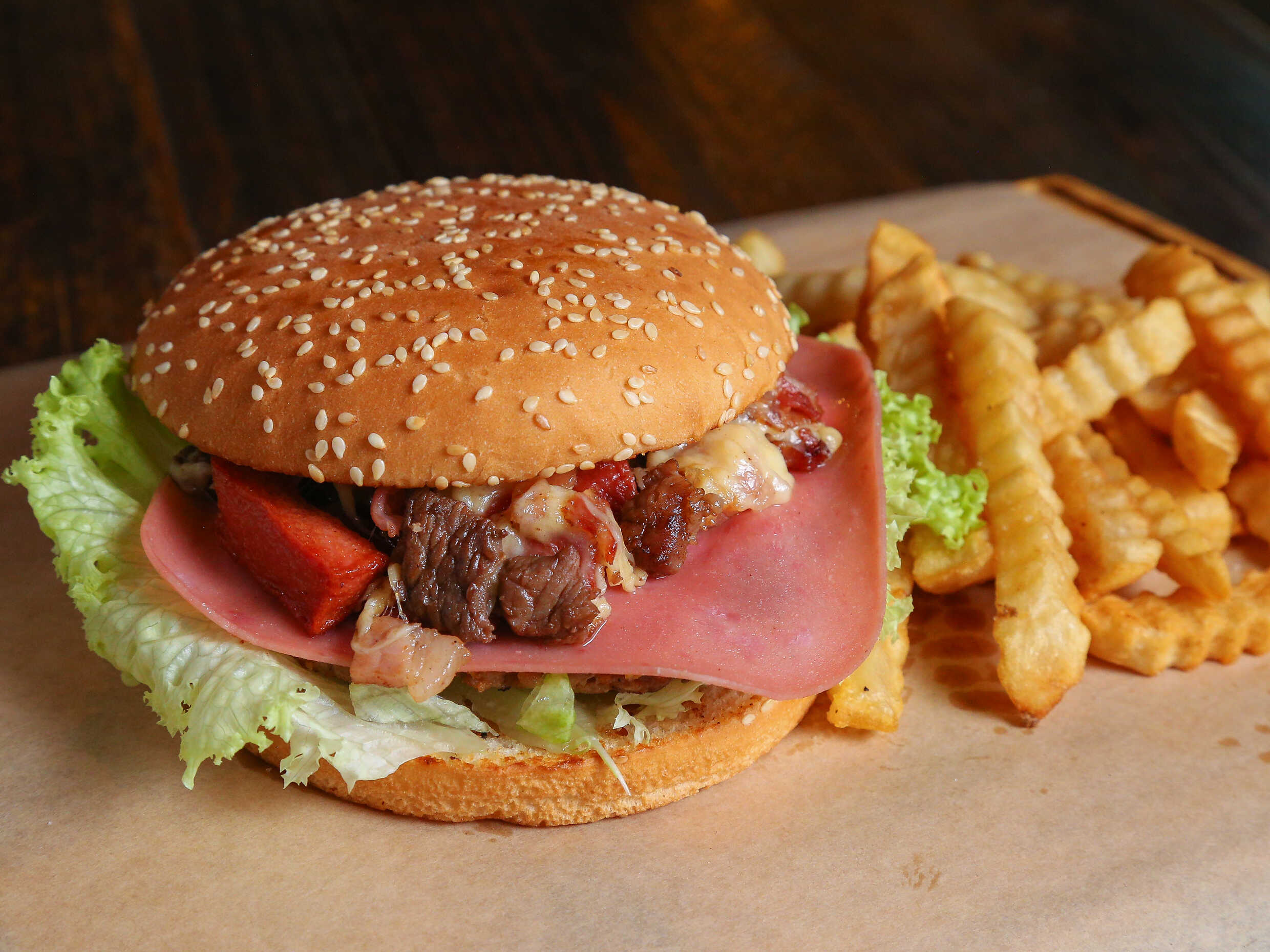 Rica hamburguesa con carne, jamón, americano, chihuahua, cebolla asada y trocitos de tocino, incluye papas.