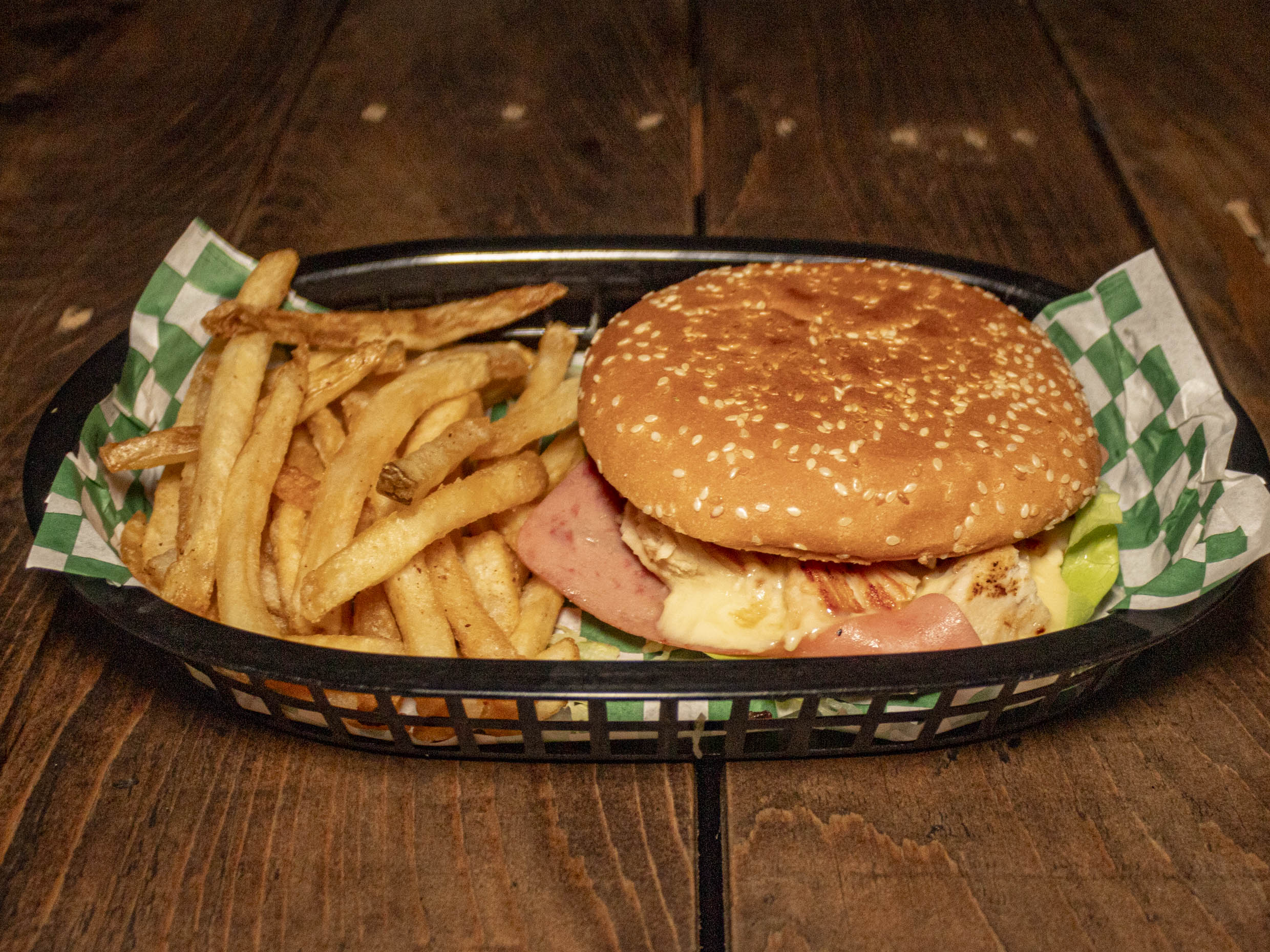 Hamburguesa gigante con jamón, chihuahua y deliciosos trozos de pollo a la plancha, incluye papas.