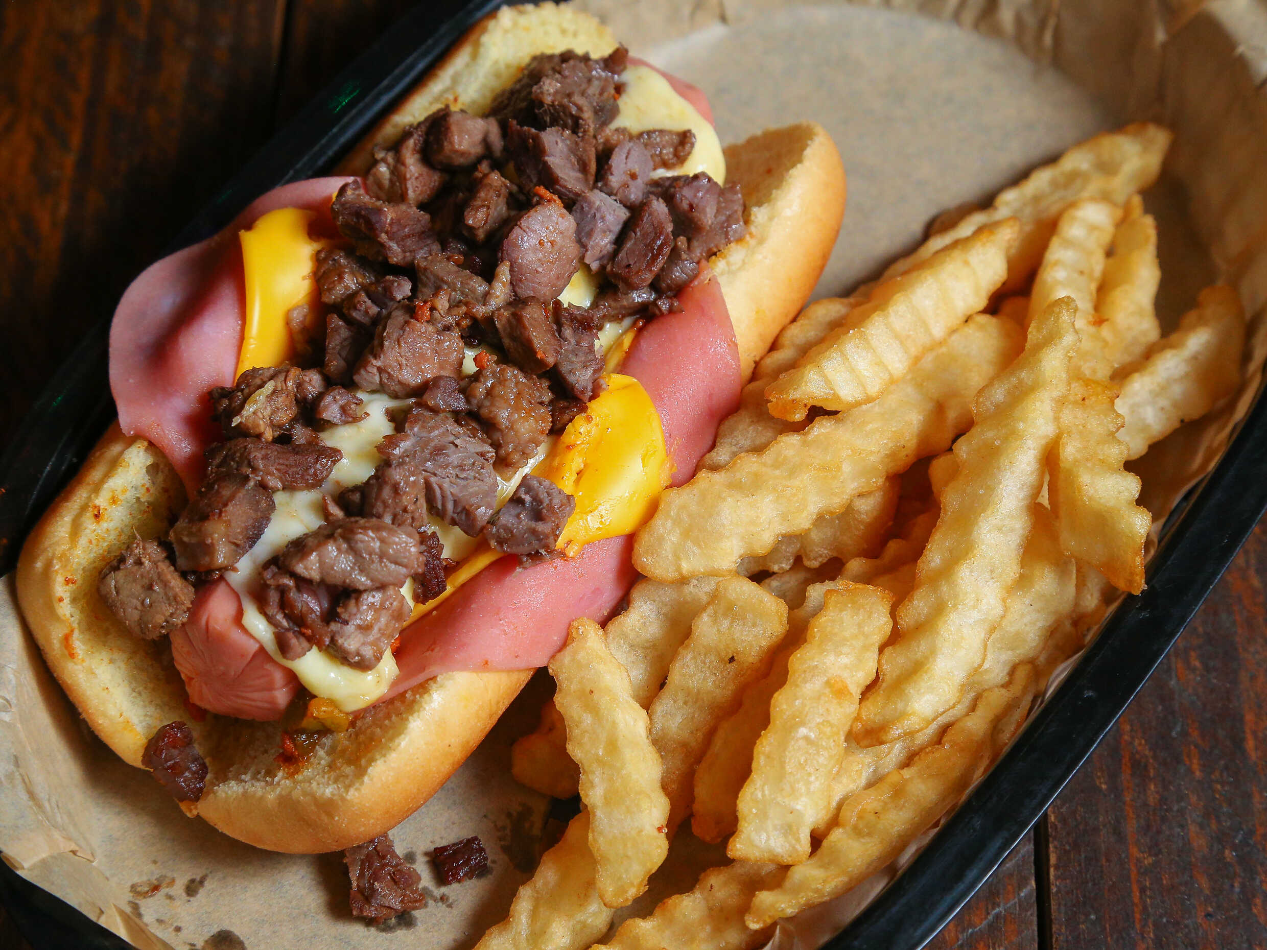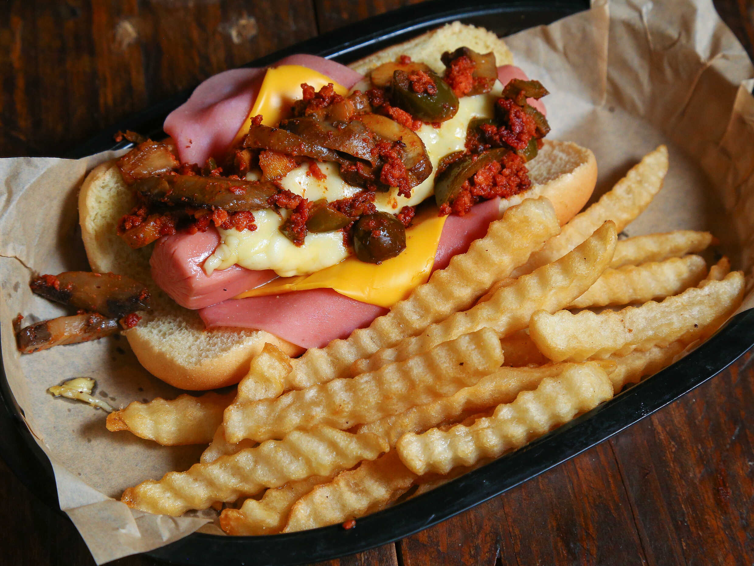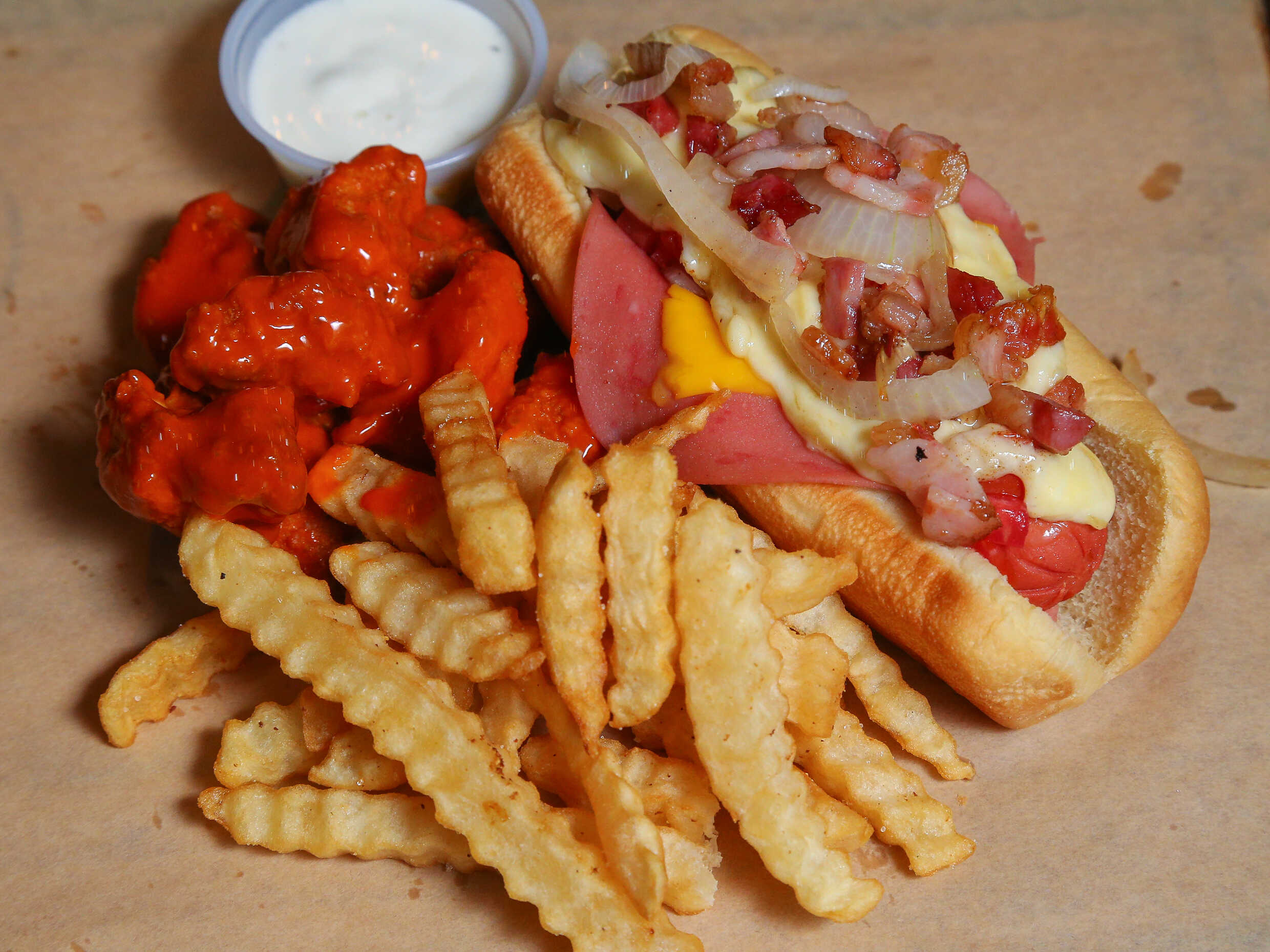 Maxidog salchicha, jamón, americano, chihuahua, cebolla asada y trocitos de tocino, acompañado de papas y boneless.