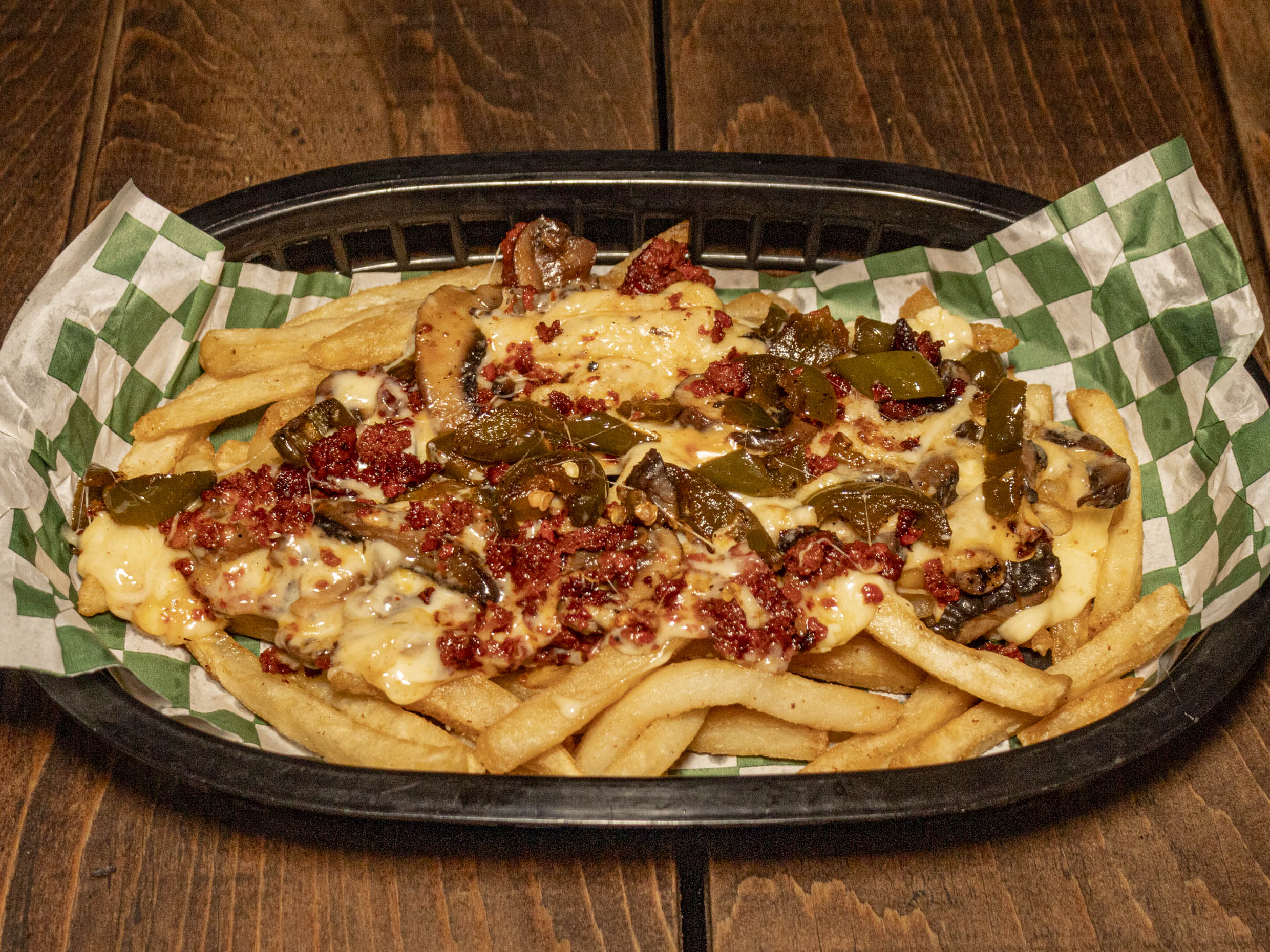 Orden de papas francesas cubiertas con un topping de champiñón, chorizo, jalapeño y chihuahua.