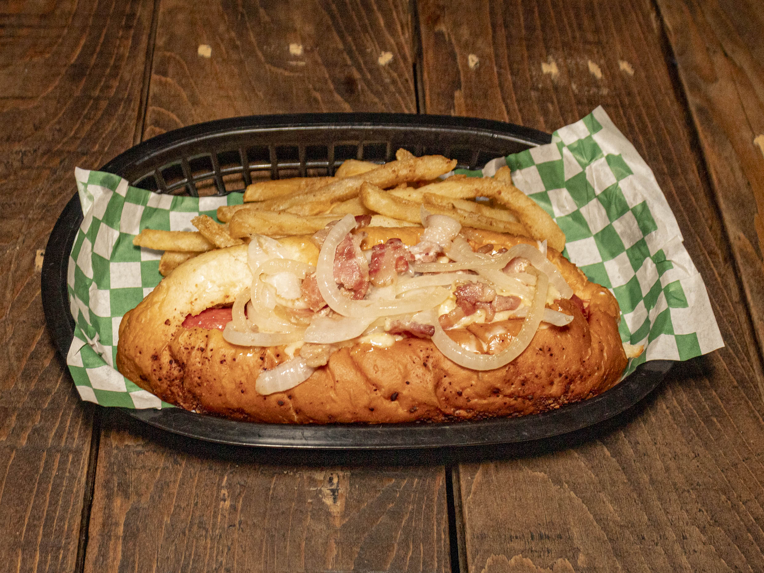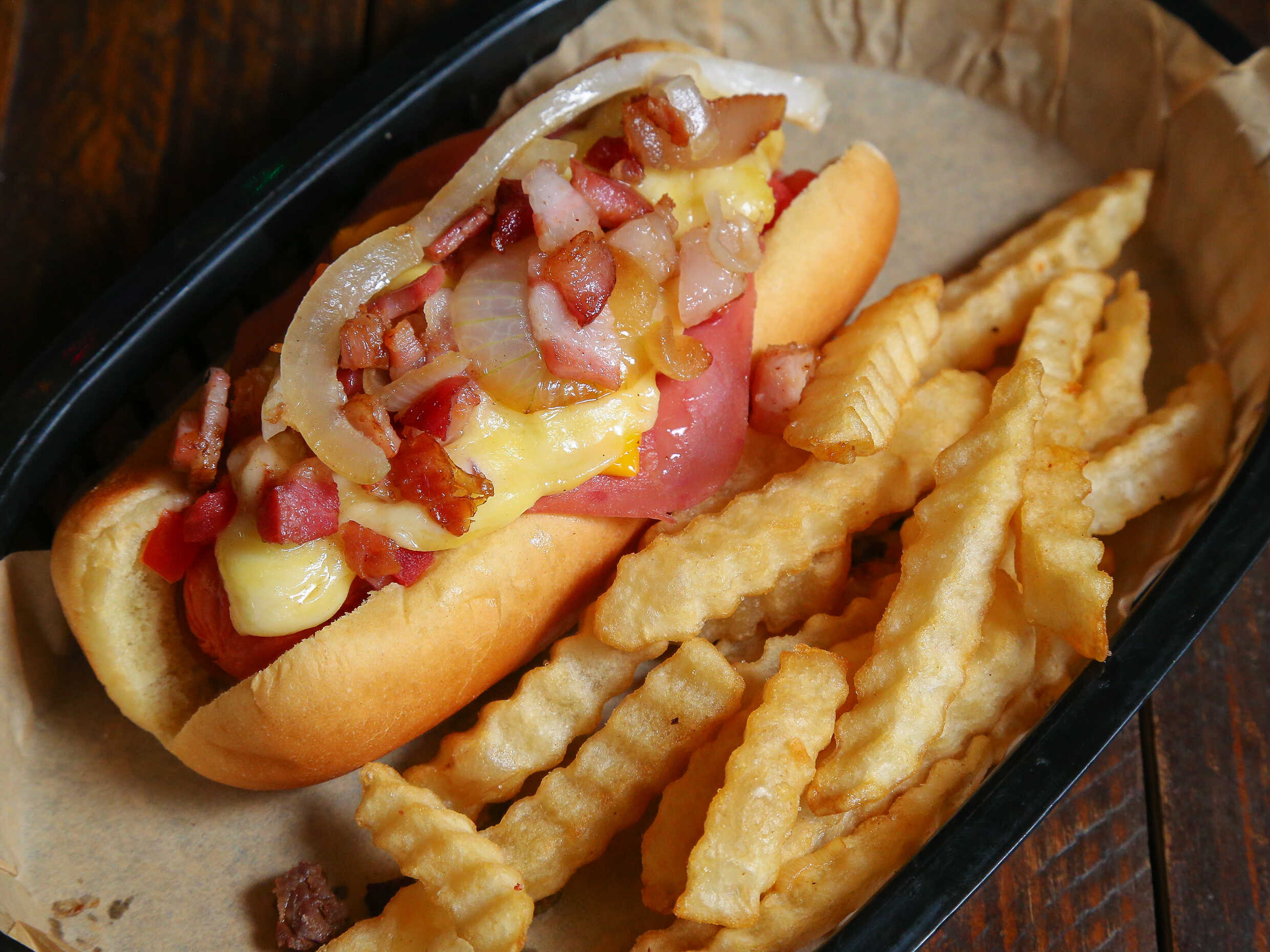 Salchicha, jamón, americano, chihuahua, cebolla asada y trocitos de tocino incluye papas.