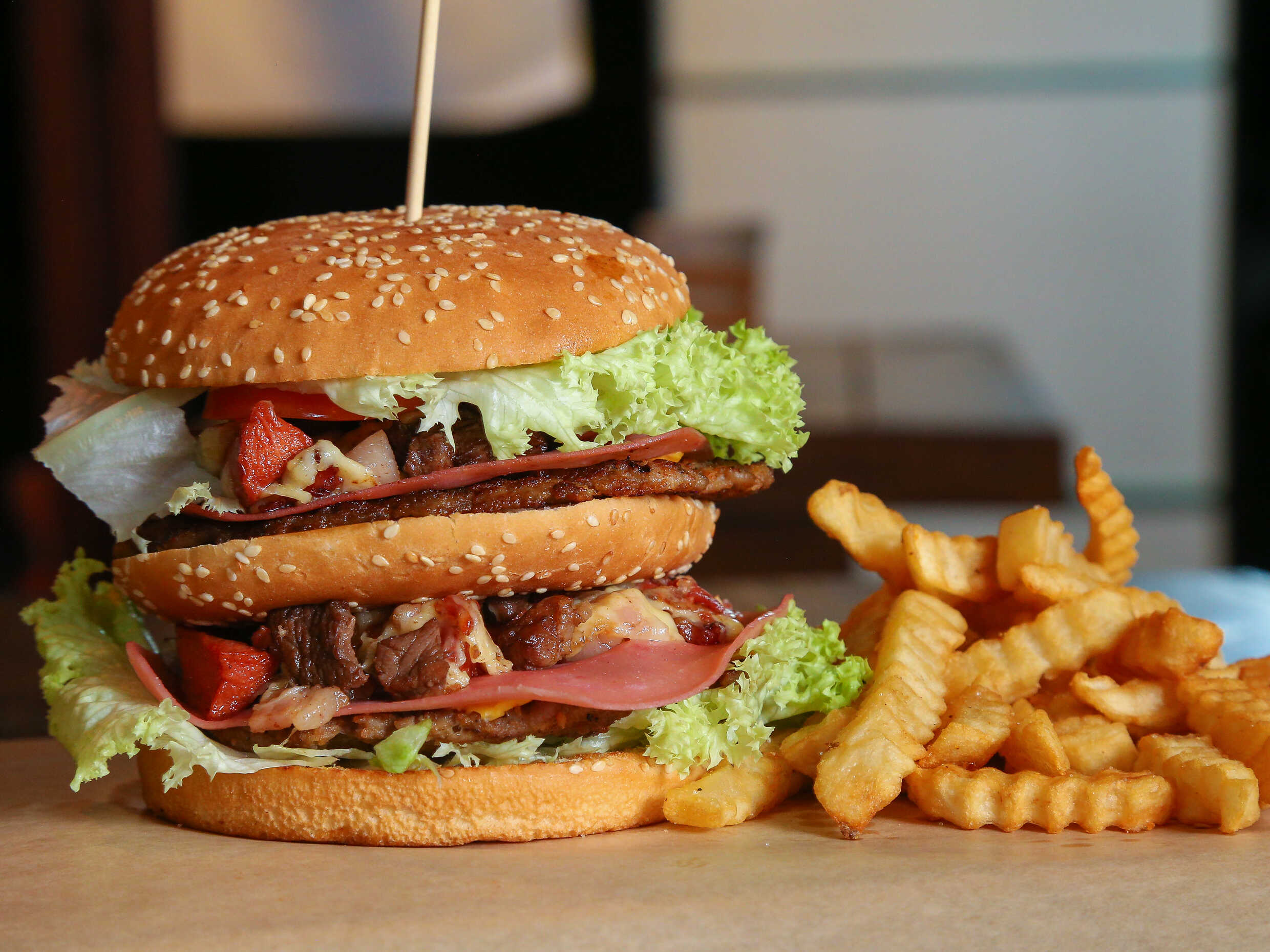Hamburguesa gigante con carne, queso americano, lechuga, tomate y mayonesa, incluye papas.