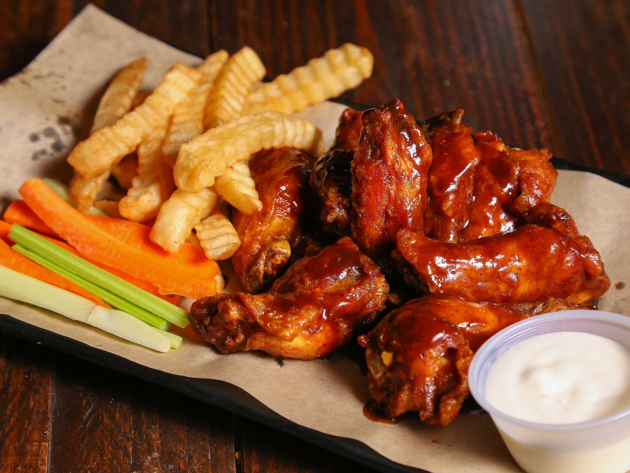 10 Piezas de alitas bañadas en salsa a elegir BBQ, hot BBQ, búfalo o mango habanero, acompañadas de apio, zanahoria y porción de papas.