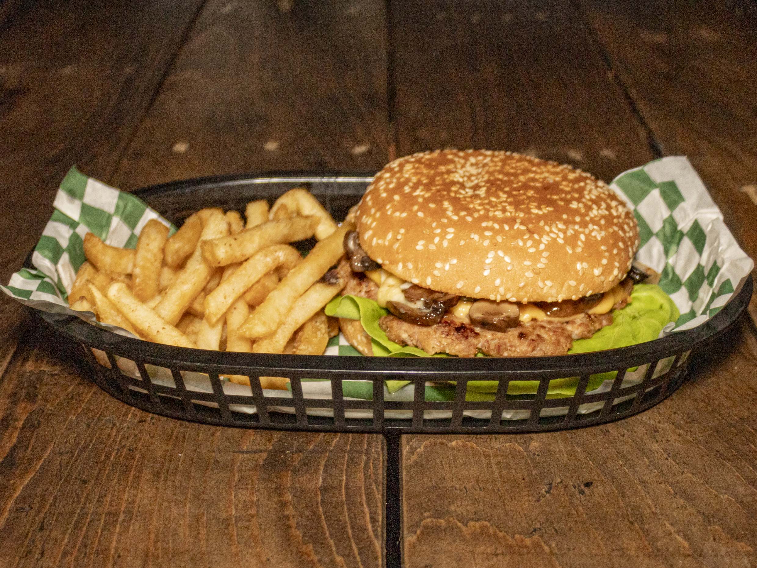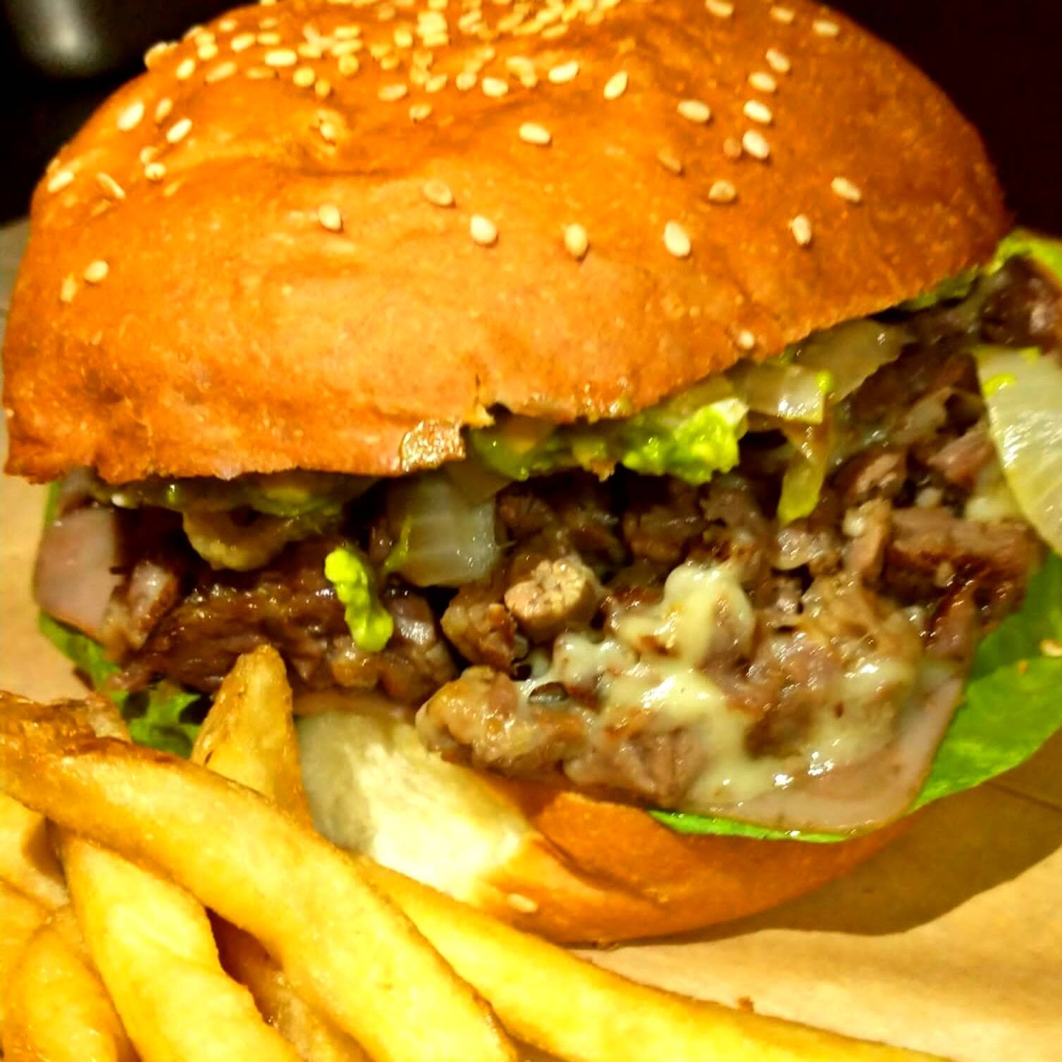 Hamburguesa gigante con carne, queso americano, chihuahua, chorizo, champiñones y jalapeños, incluye papas.