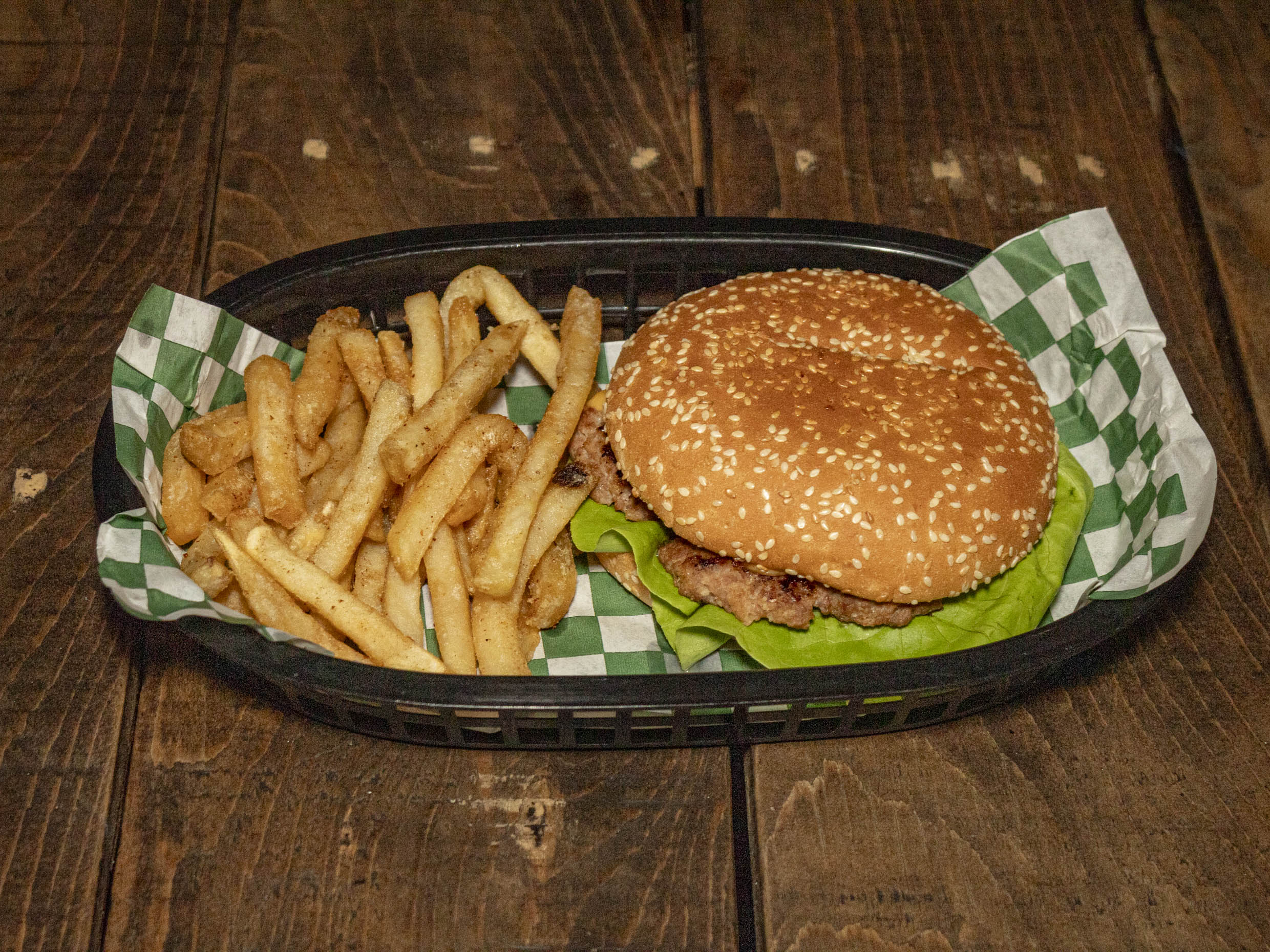 Hamburguesa sencilla carne y queso americano, acompañada de alitas y papas.