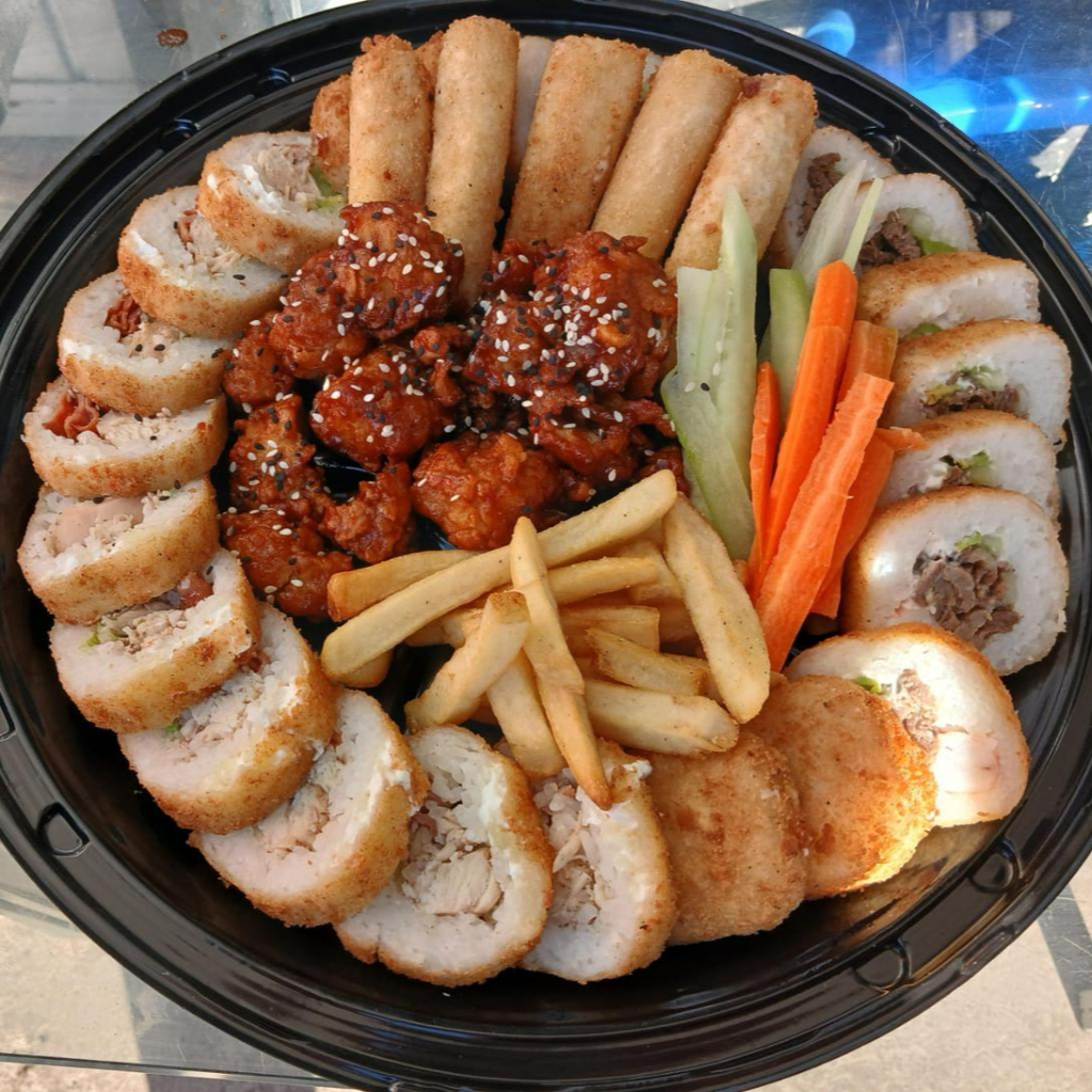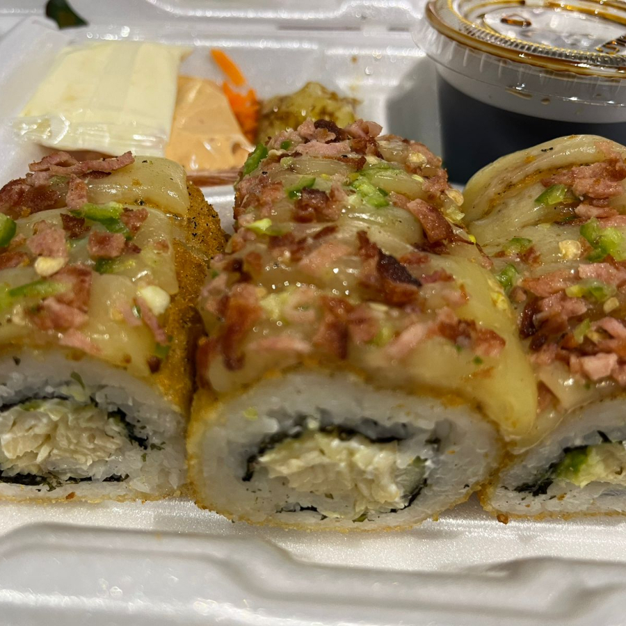 rollo empanizado relleno de pollo con gratinado especial, bolitas de tampico,camarones fritos, serrano y ajonjoli