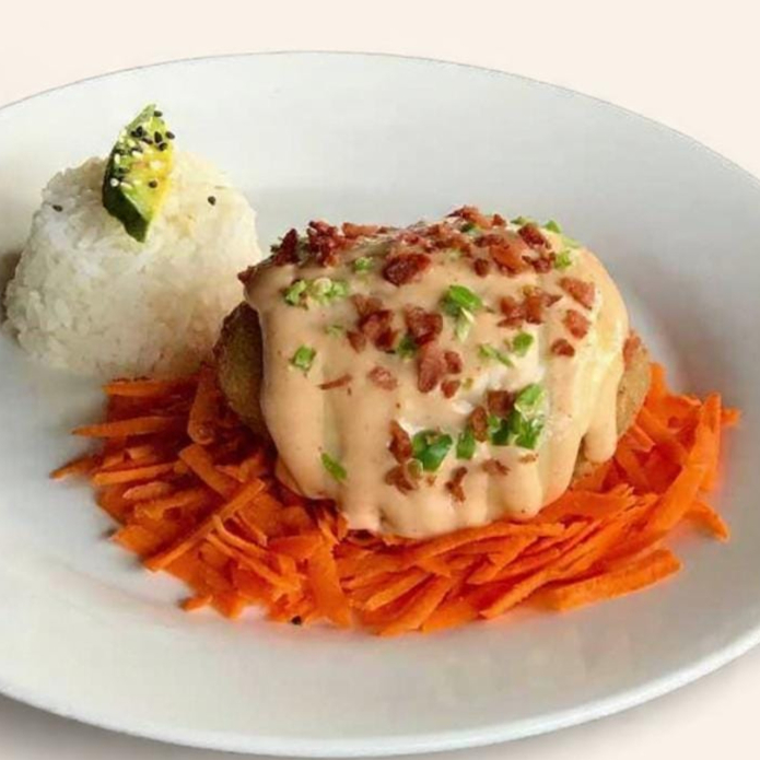 Arroz frito, acompañado con Tampico, aguacate, Philadelphia, coronado con camarones empanízados, y un toque de ajonjolí