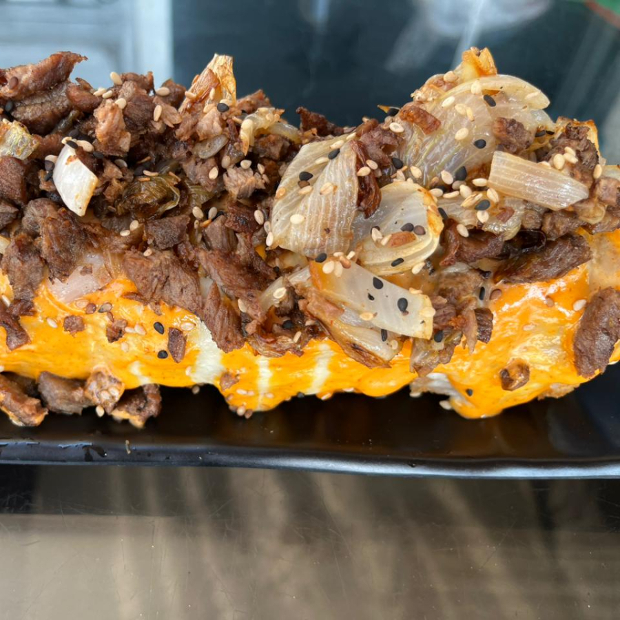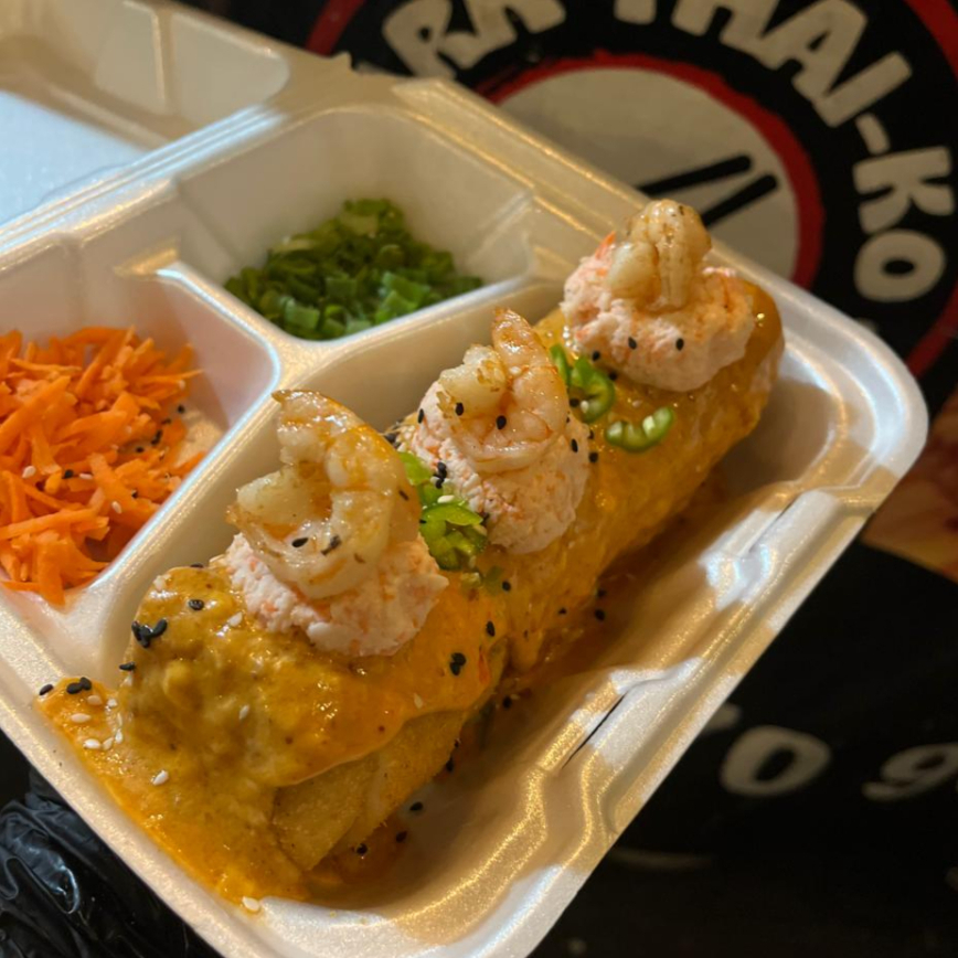 tortilla de harina empanizada rellena de res, pollo, philadelphia, y arroz. con topping gratinado con Tampico, bañada con salsa especial y anguila con punto de sriracha.