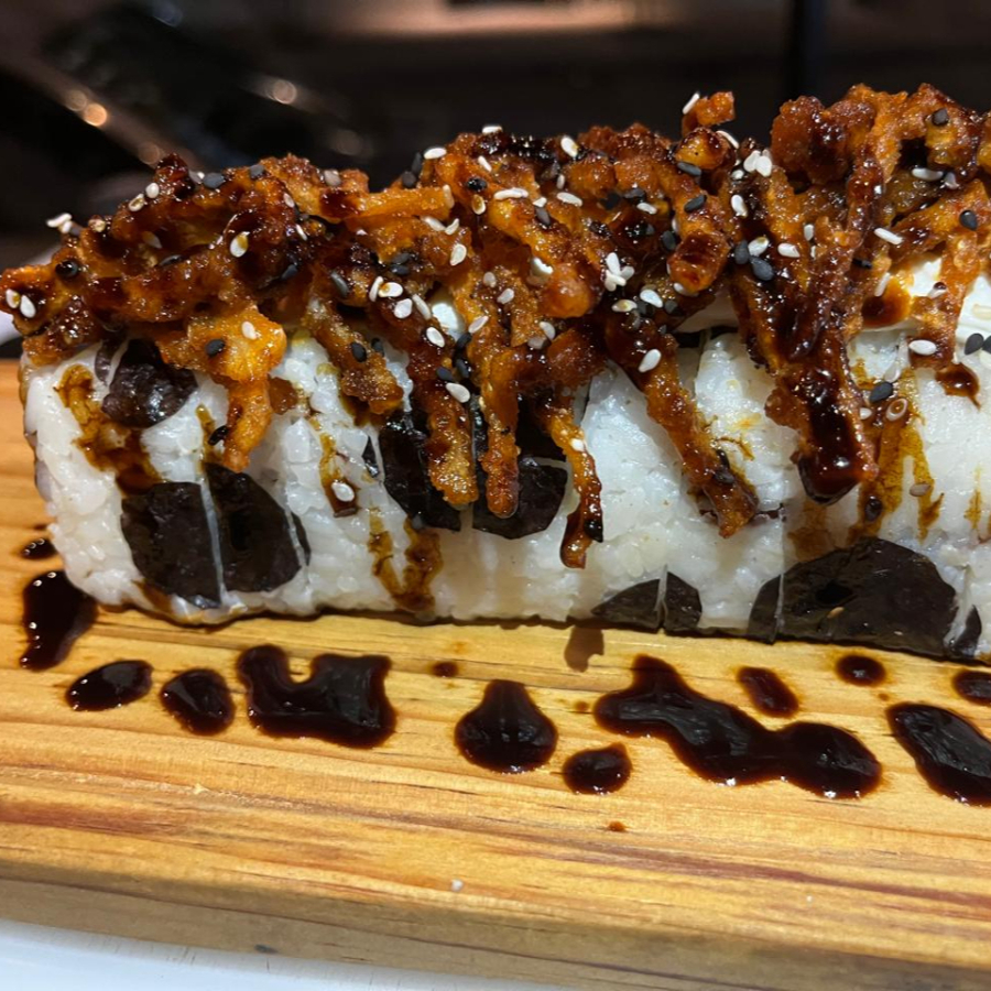 Rollo de tocino con topping de pollo crunchy salseado con bbq y anguila, con cebollín y ajonjol
