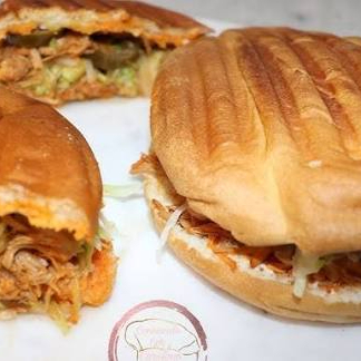 Torta de cochinita con lechuga, tomate, cebolla y aguacate a la.plancha