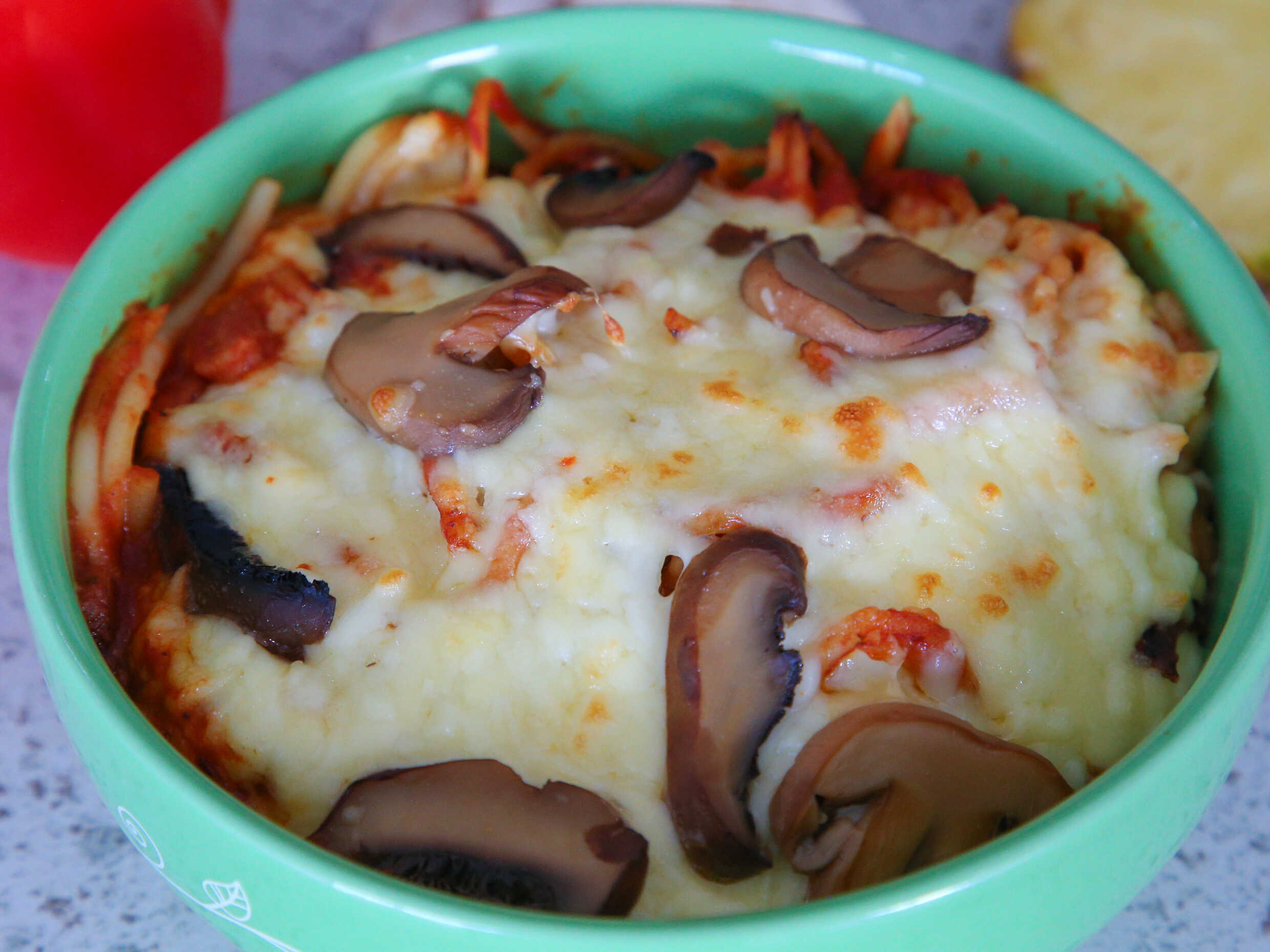 Pasta, queso y mezclado con champiñón.