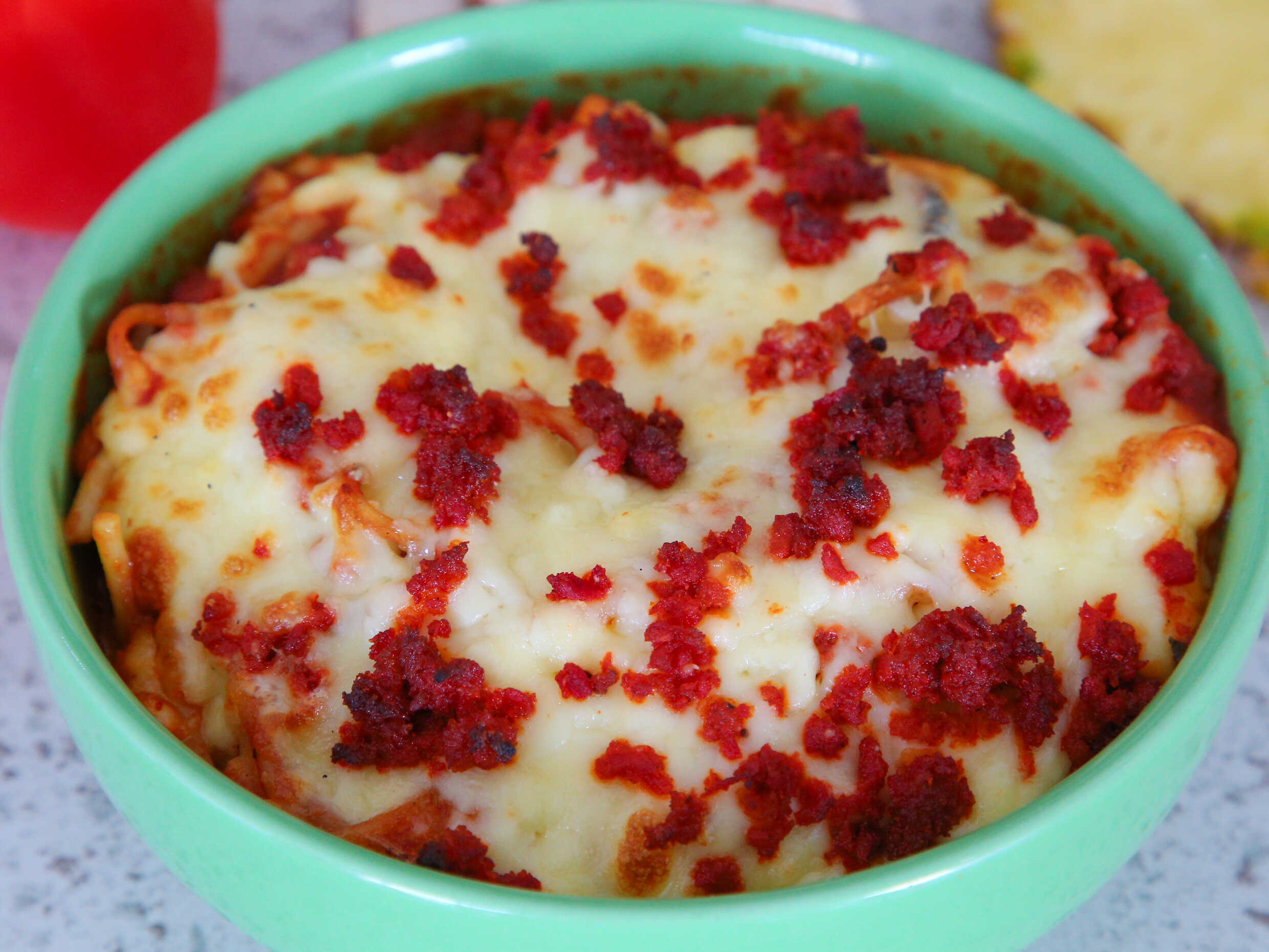 Pasta, queso y mezclado con chorizo.