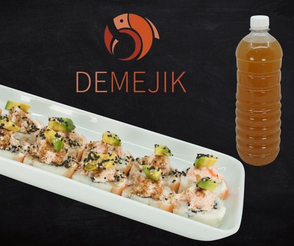 Rollo de 14 piezas natural relleno de queso crema Philadelphia y aguacate, encima decorado con camarones curtidos, chile serrano y cebollín, espolvoreado con ajonjolí, acompañado de rodajas de pepino en jugo de soya de aguachile.