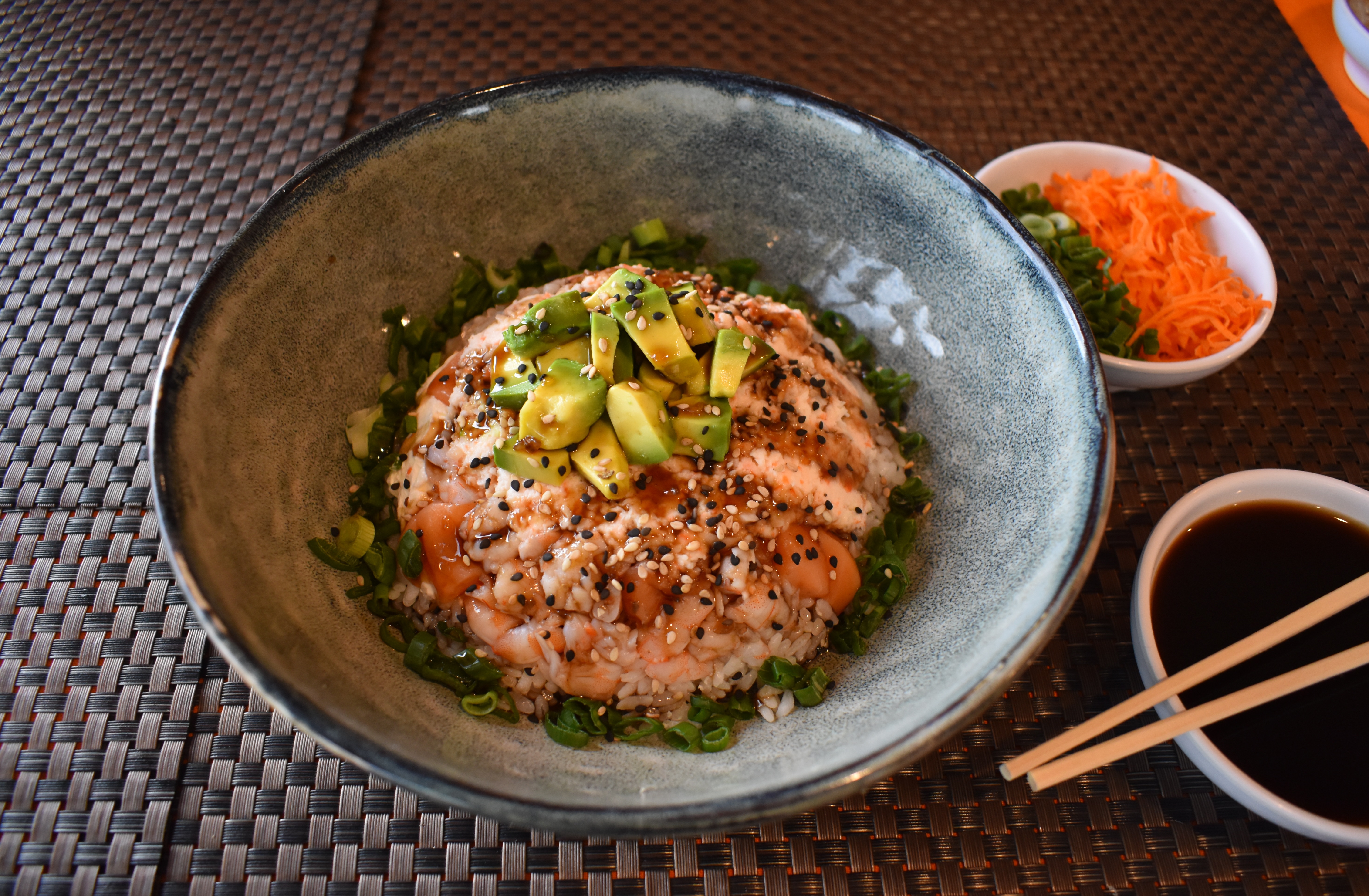 Arroz blanco, queso crema Philadelphia, salmón, camarón y tampico, coronado con aguacate, espolvoreado con ajonjolí y rayado con salsa de anguila.