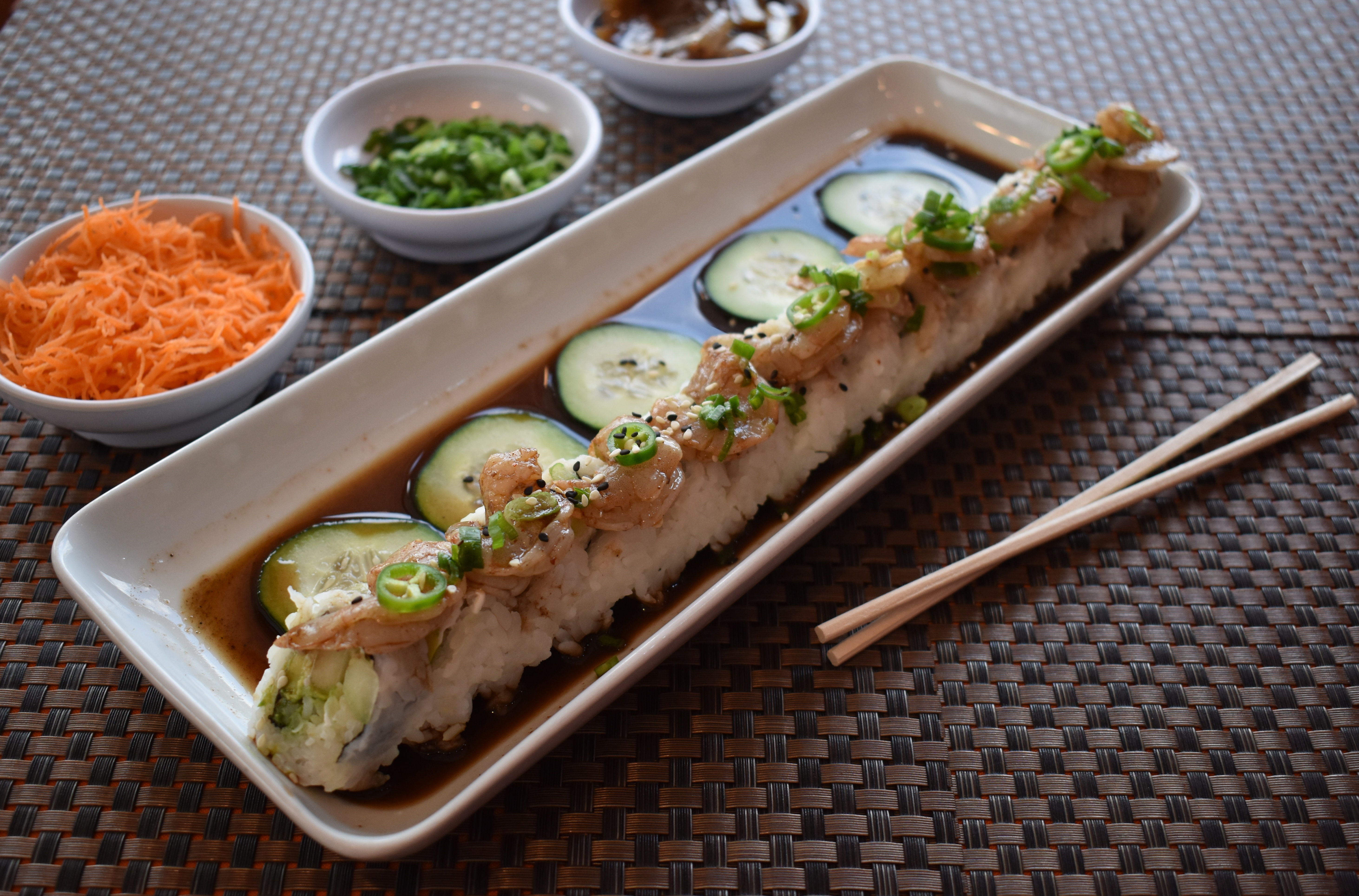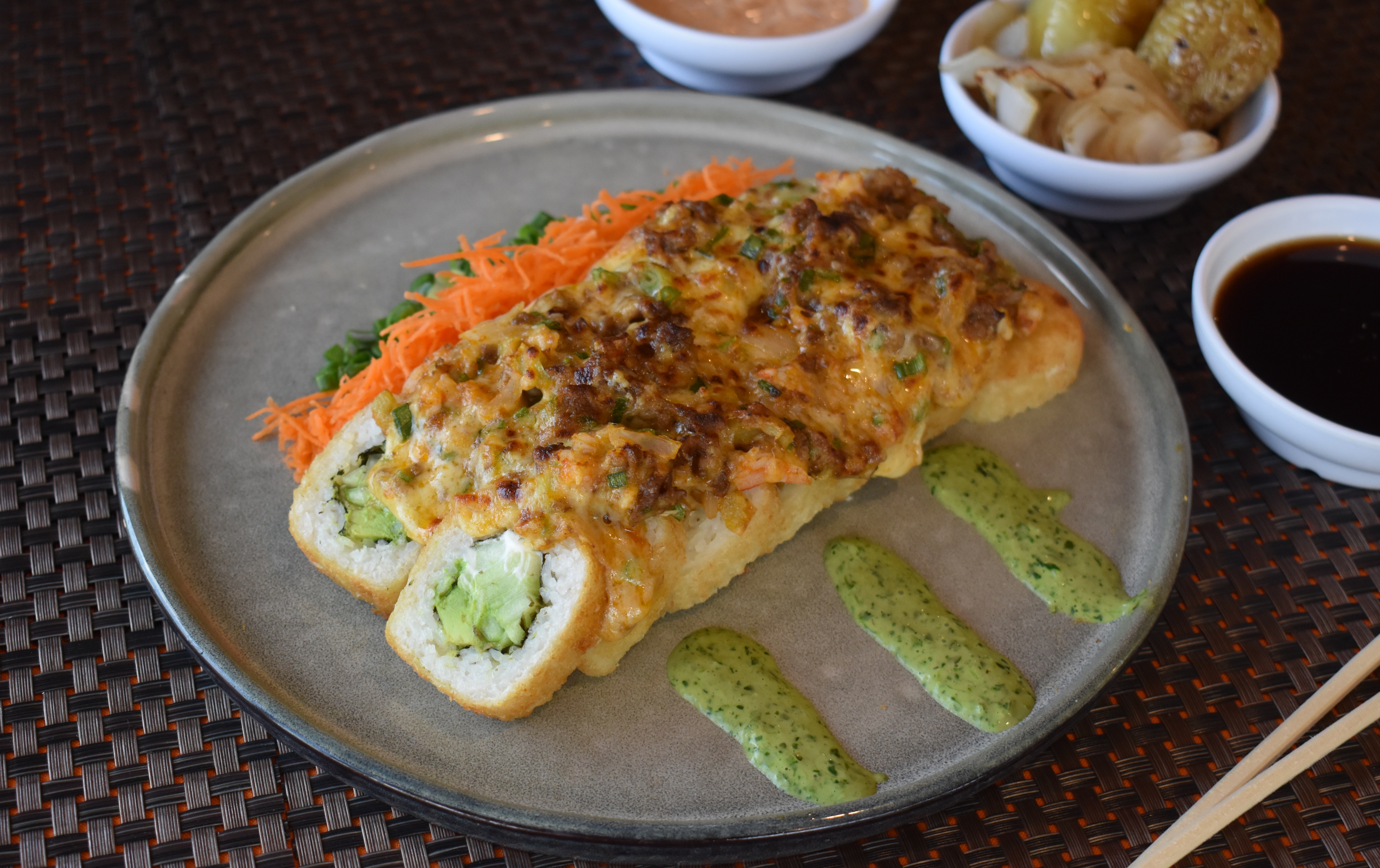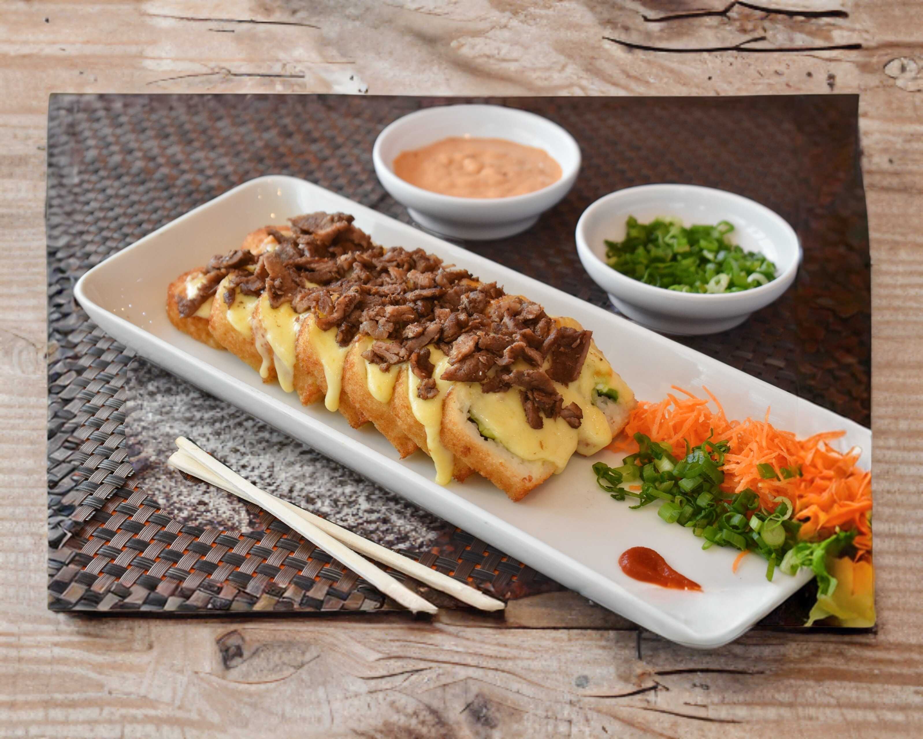 Rollo de 14 piezas relleno con queso crema Philadelphia, aguacate y pepino, horneado con topping de queso fundido, camarón, carne de res, cebollitas asadas, chile caribe, cebollín y sriracha.