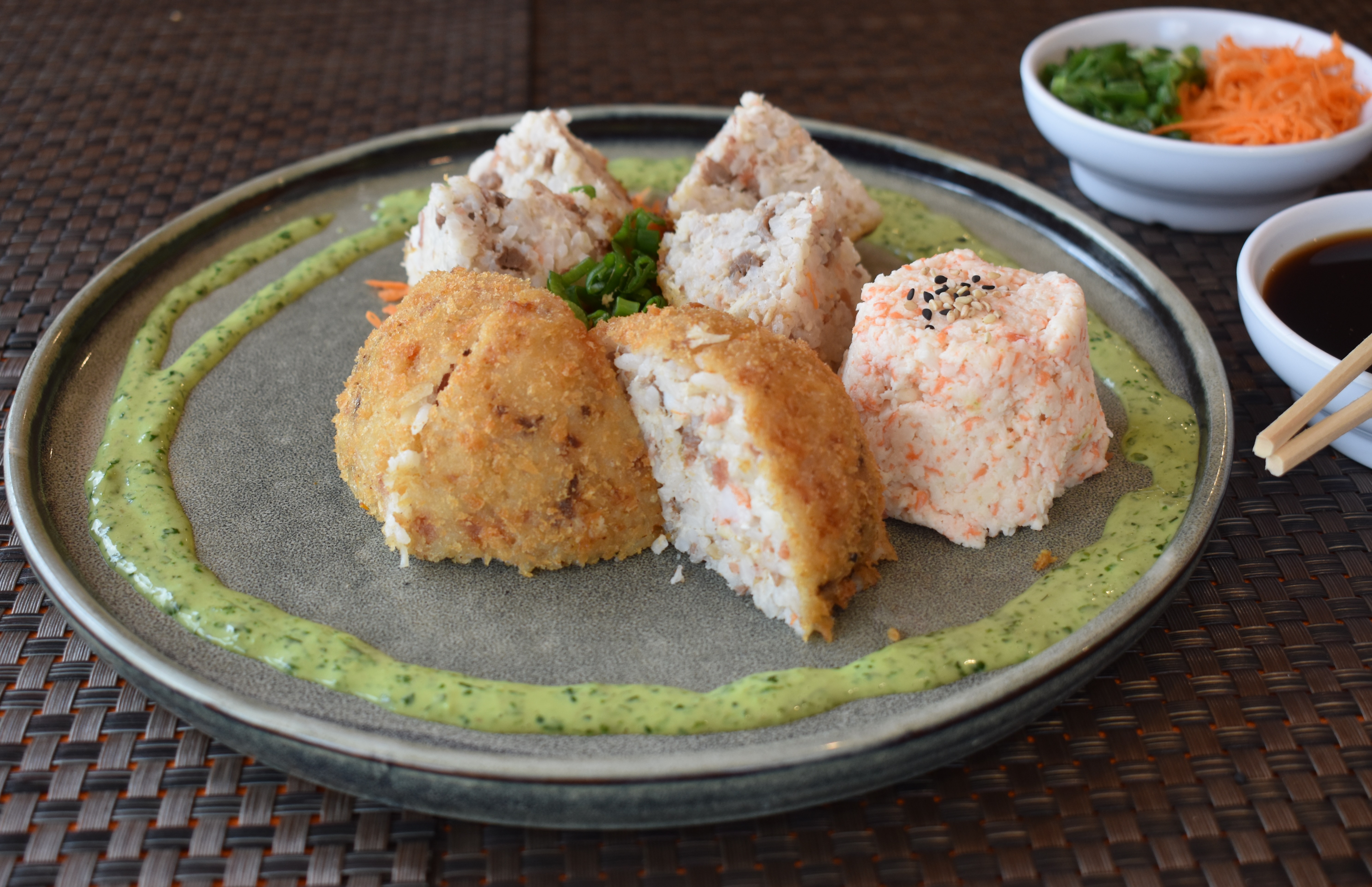Bola de arroz empanizada, rellena de camarones, carne de res, pechuga de pollo, tocino y queso crema Philadelphia, sobre una cama de zanahoria y cebollín, acompañada de tampico, rayada con aderezo de cilantro.