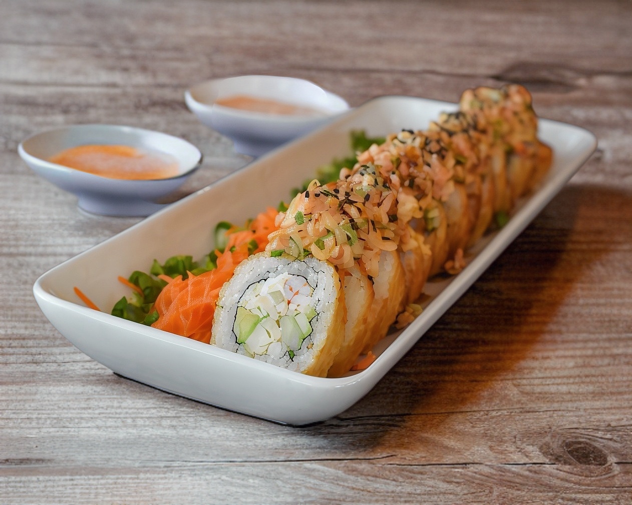 Rollo de 14 piezas empanizado relleno de queso crema Philadelphia, aguacate y pepino, horneado con queso chihuahua y kanikama en spicy, camarones capeados, aguacate y sriracha encima.