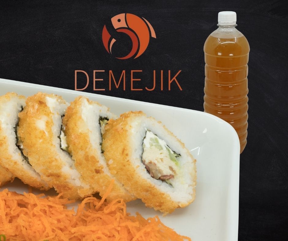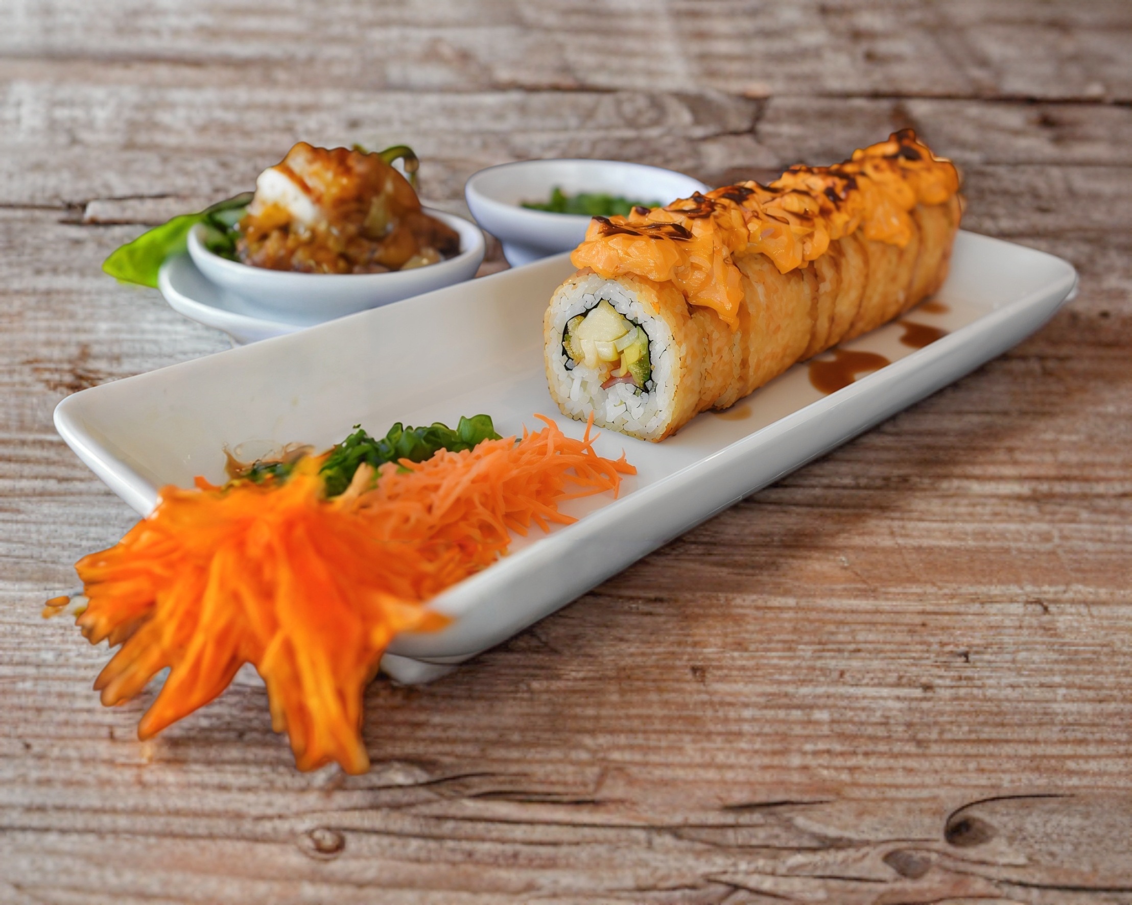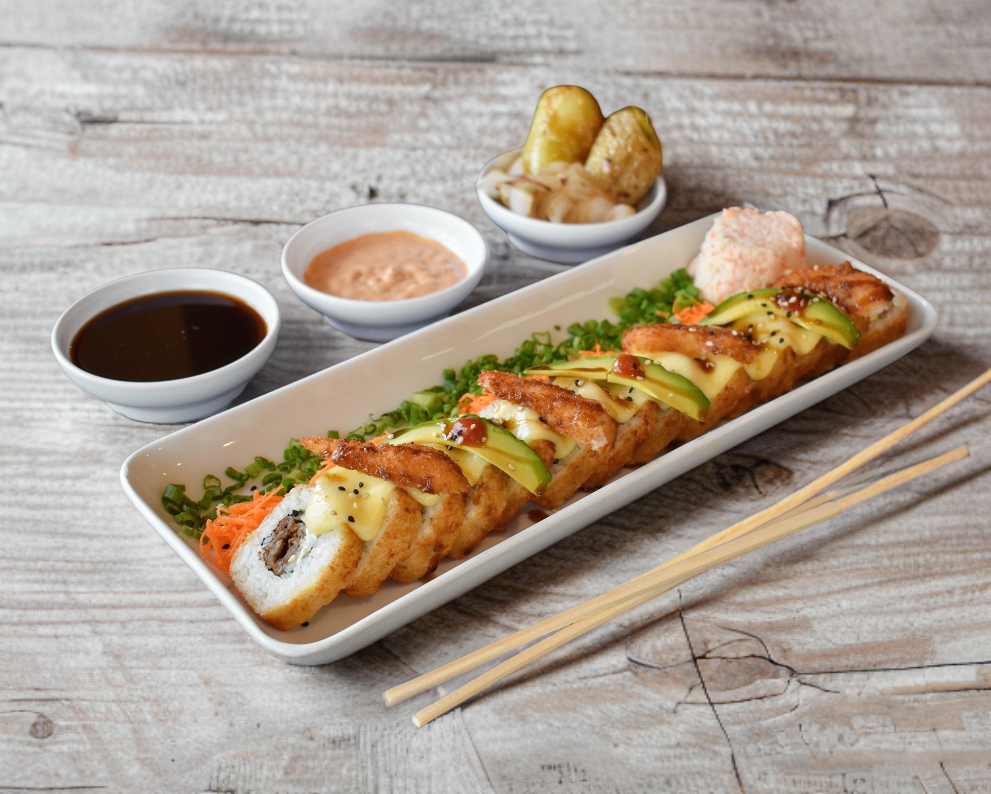 Rollo de 14 piezas empanizado, relleno de tocino, pechuga de pollo a la plancha, aguacate y pepino, horneado con paté spicy de camarones, bañado ligeramente en salsa de anguila.