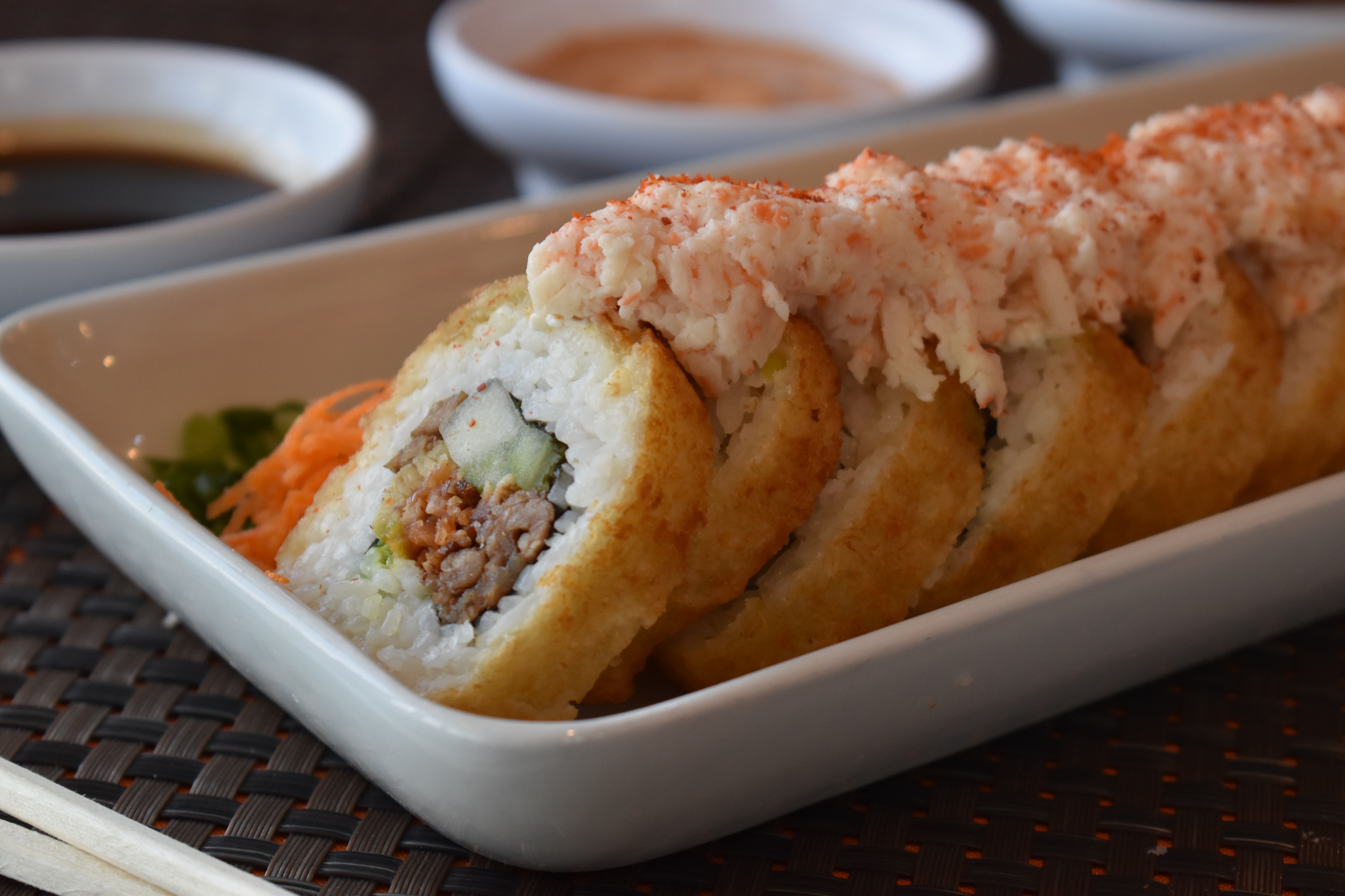 Rollo de 14 piezas empanizado relleno de pechuga de pollo, carne de res, tocino, aguacate y pepino, por fuera queso crema Philadelphia y chile caribe, con topping de tampico espolvoreado con chile crash.