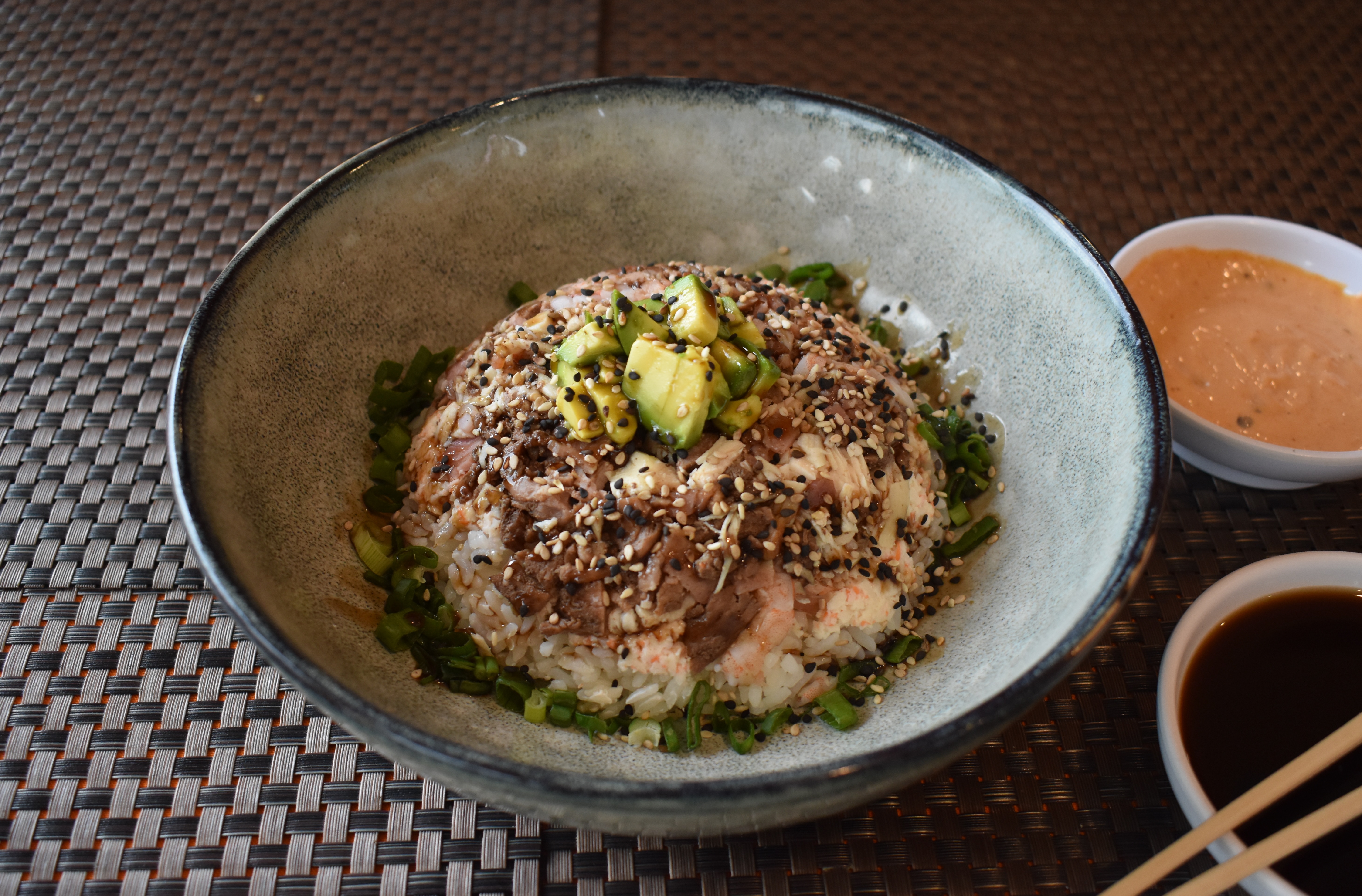 Arroz blanco, queso crema Philadelphia, tampico, carne de res, camarón, pechuga de pollo y tocino, coronado con aguacate espolvoreado con ajonjolí, rayado con salsa de anguila.