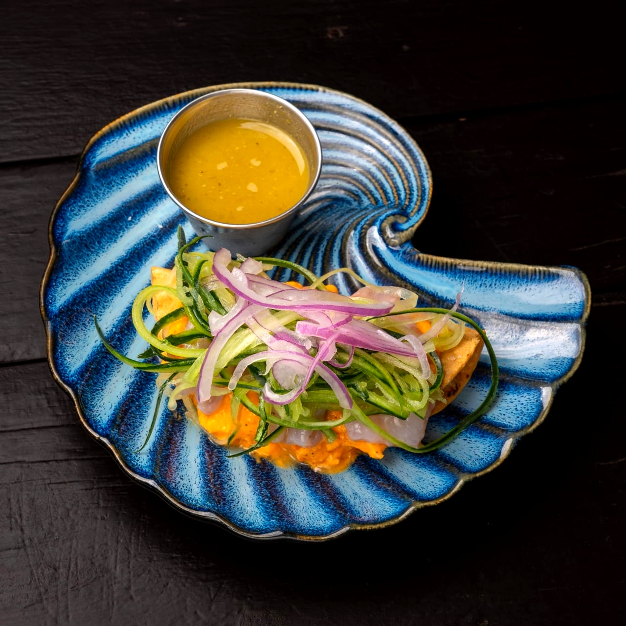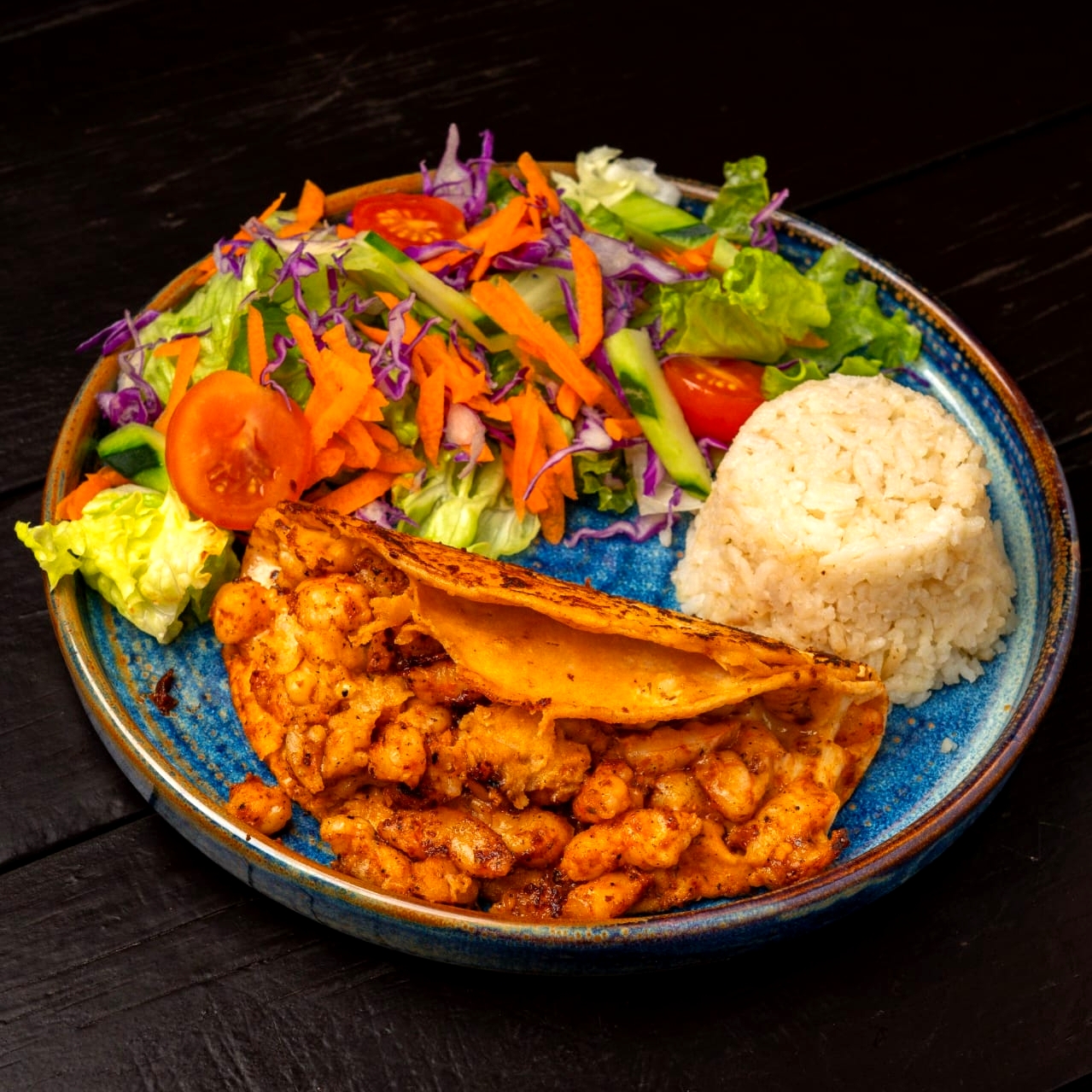 DELICIOSA COSTRA DE QUESORELLENA DE ARRACHERA Y CAMARONES A LA PLANCHA CON TORTILLA DE MAIZ Y ADEREZO CHIPOTLE