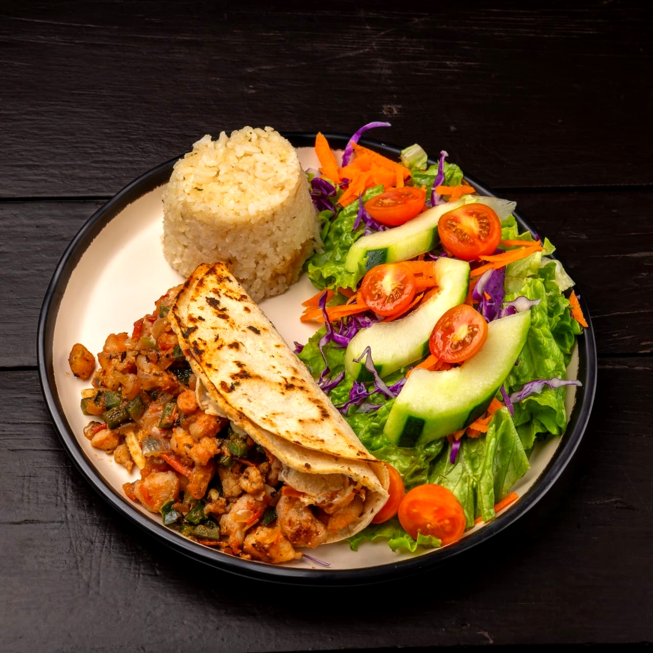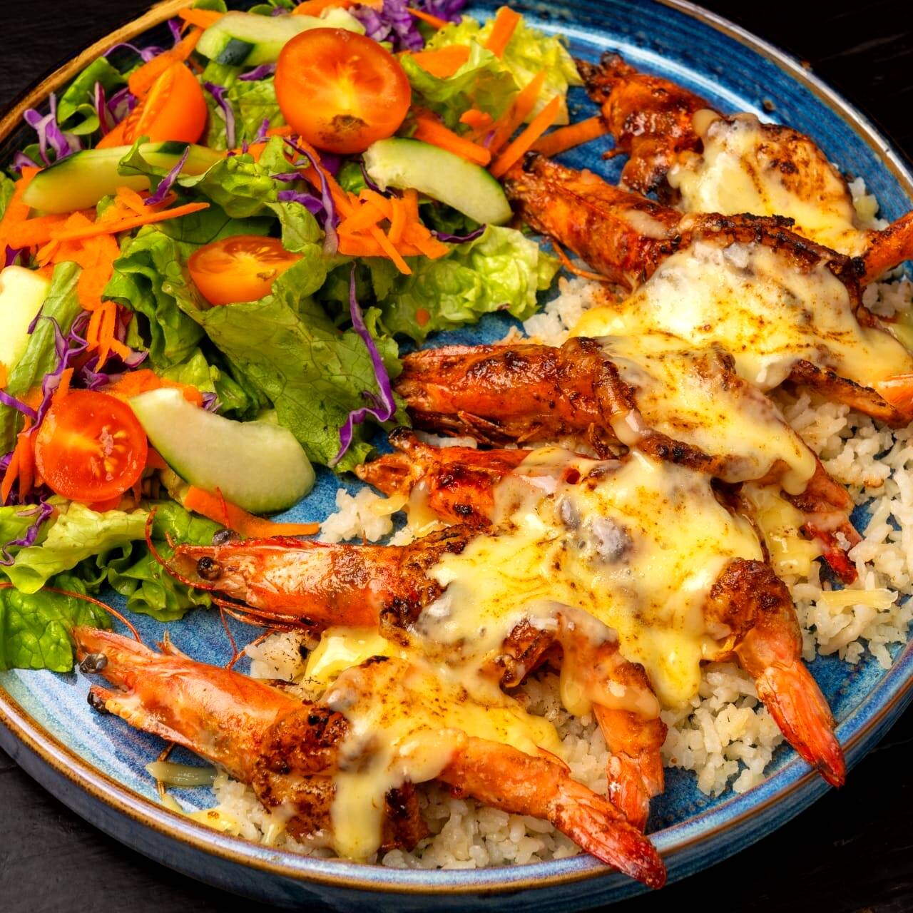 CAMARONES ZARANDEADOS Y GRATINADOS, ACOMPAÑADOS CON ENSALADA Y ARROZ