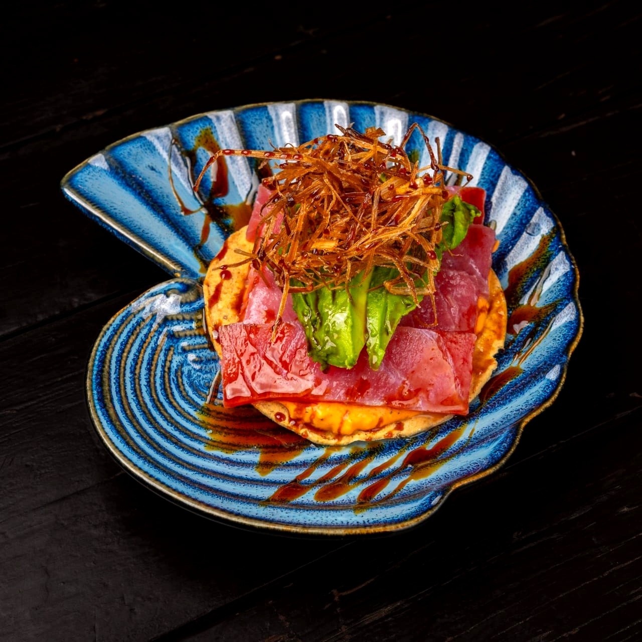 TOSTADA UNTADA DE PATE DE CAMARON , LAMINAS DE ATUN ,AGUACATE MONTADO,Y CORONADO CON PORO