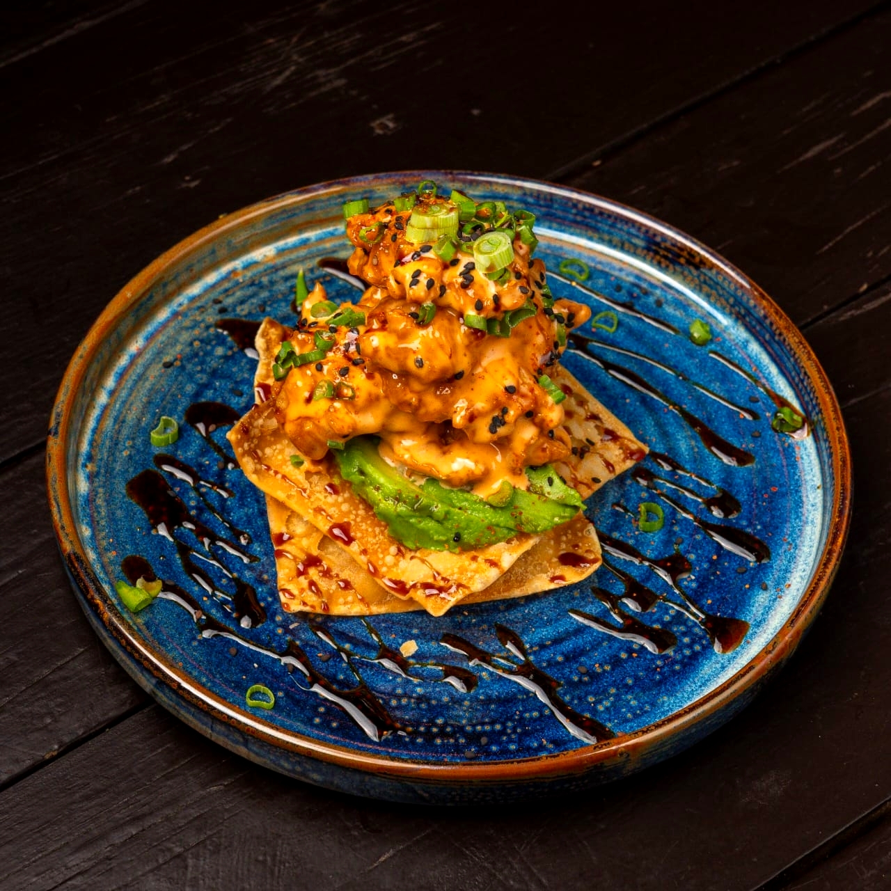 TOSTADA DE CAMARONES CRUNCHY BAÑADOS CON ADEREZO DE LA CASA , CORONADO CON AGUACATE