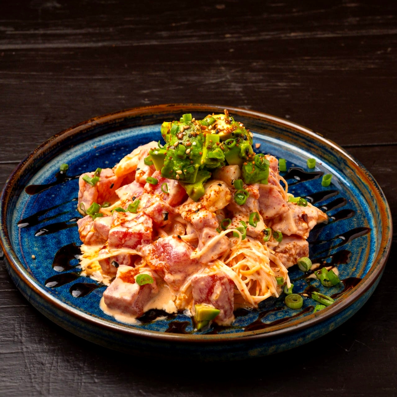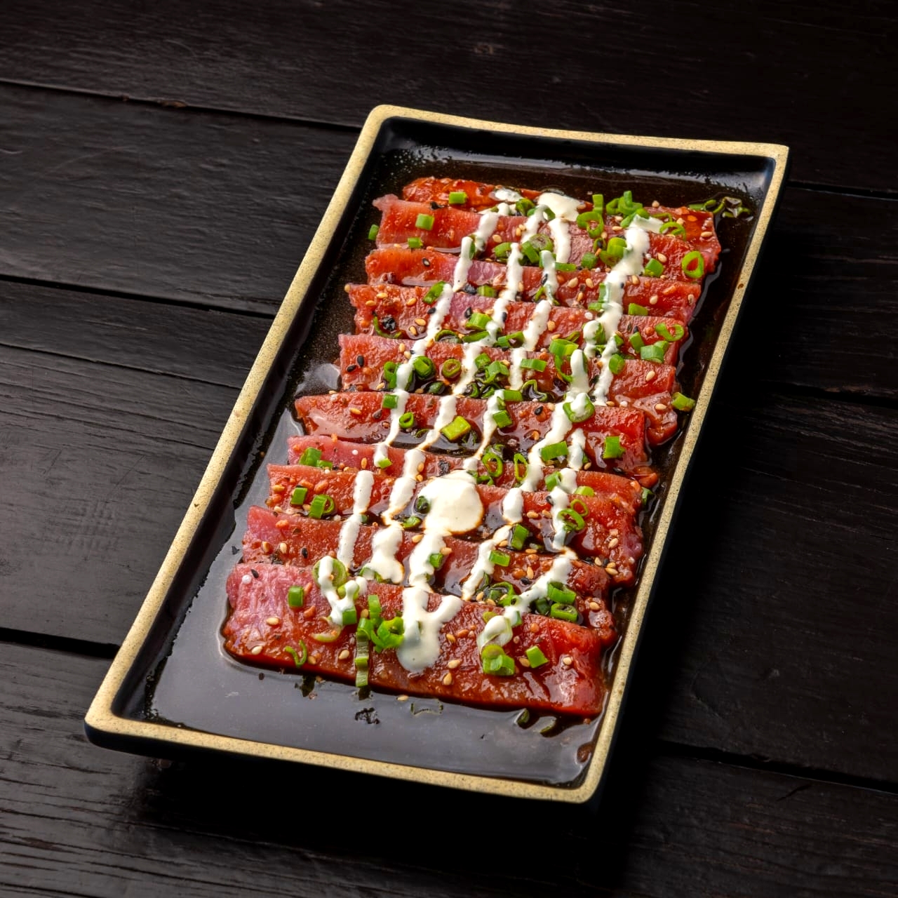 LAMINAS DE ATUN BAÑADAS EN SALSA NEGRA CORONADO CON CEBOLLIN ,FURIKAKE Y ADEREZO