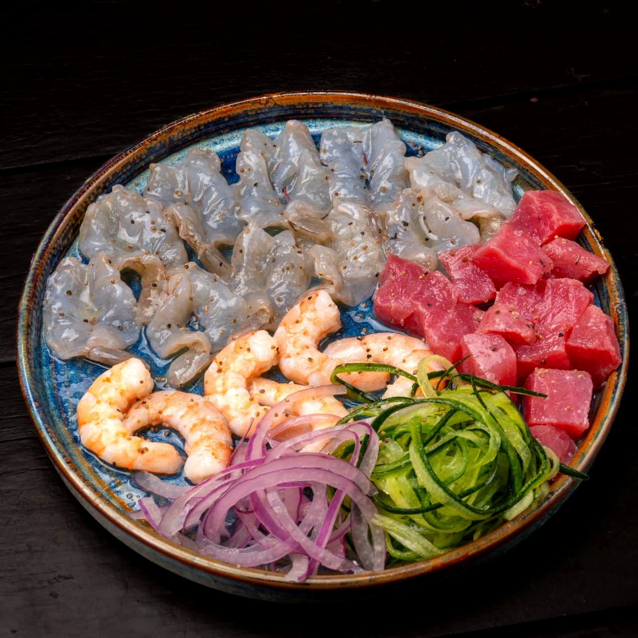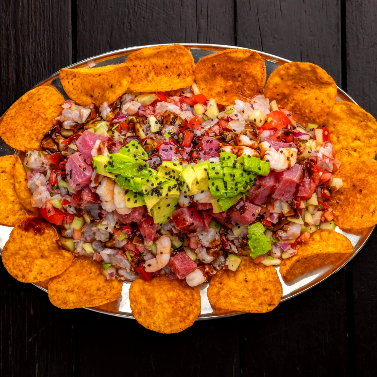 CEVICHE DE CAMARON CORONA DE ATUN , CAMARON COCIDO,Y AGUACATE CON TOSTITOS