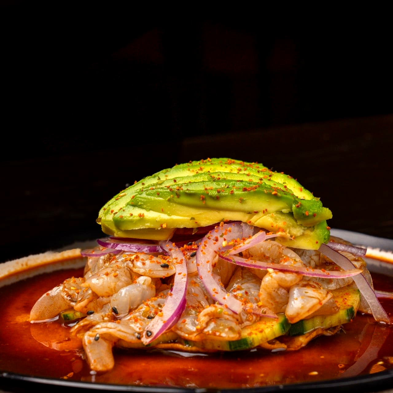 AGUACHILE MIXTO BAÑADO EN SALSA NEGRA MONTADO EN TOSTADA