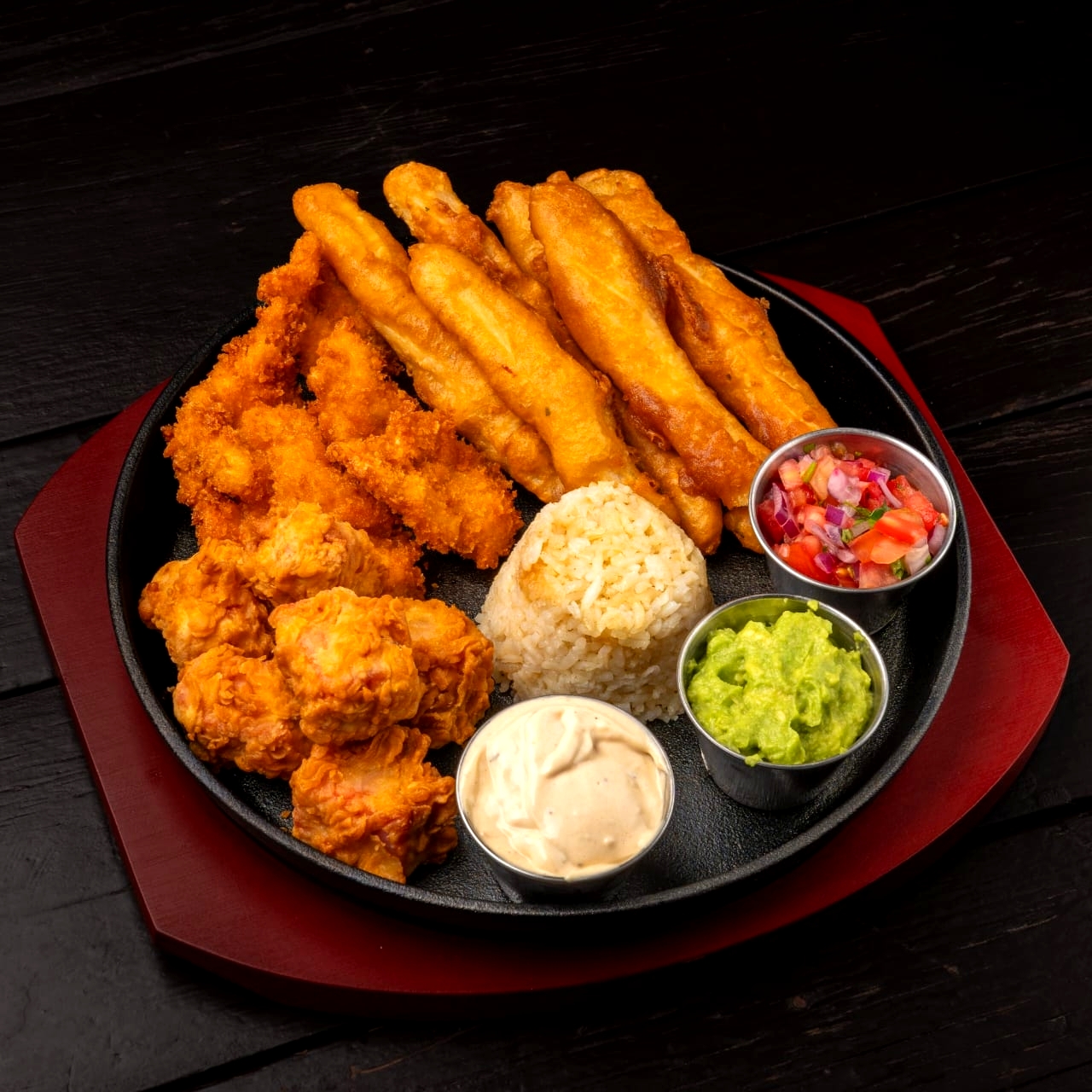 CHICHARRON DE ATUN , TIRAS DE PESCADO CAPEADO , CAMARONES EMPANIZADOS, ACOMPAÑADO DE PICO DE GALLO Y AGUACATE