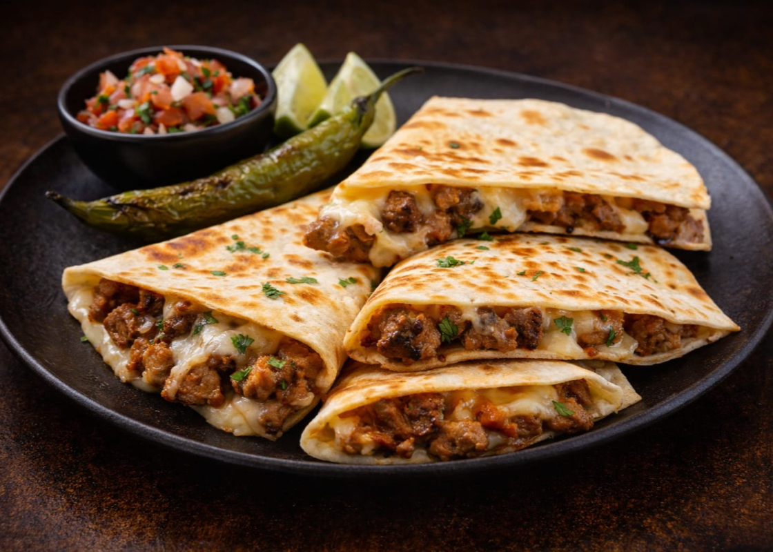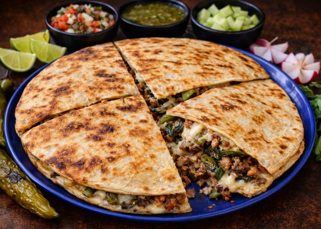 Quesadilla de tortilla de harina rellena de carne asada y queso derretido, acompañada de salsa y limón.
