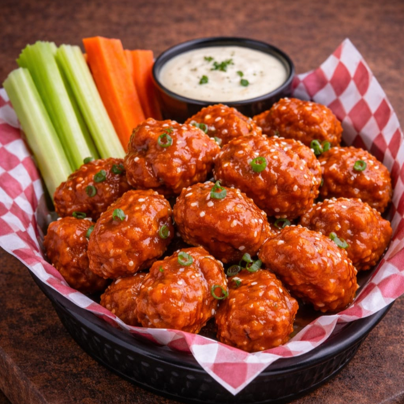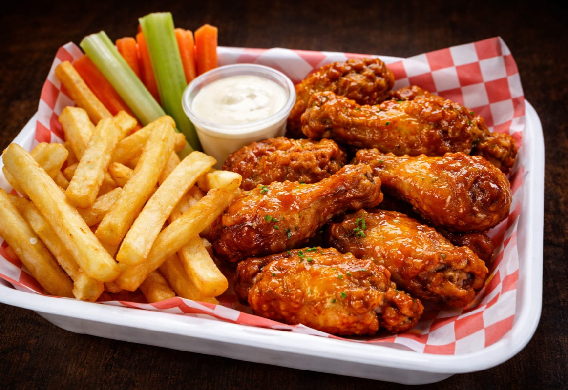 Jugosas alitas cubiertas con nuestra salsa especial, acompañadas de crujientes papas a la francesa, bastones frescos de zanahoria y apio, y aderezo cremoso.