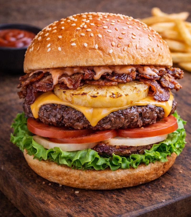 Combinación tropical de carne de res, queso, jamón, tocino, piña asada, verduras y papas fritas.