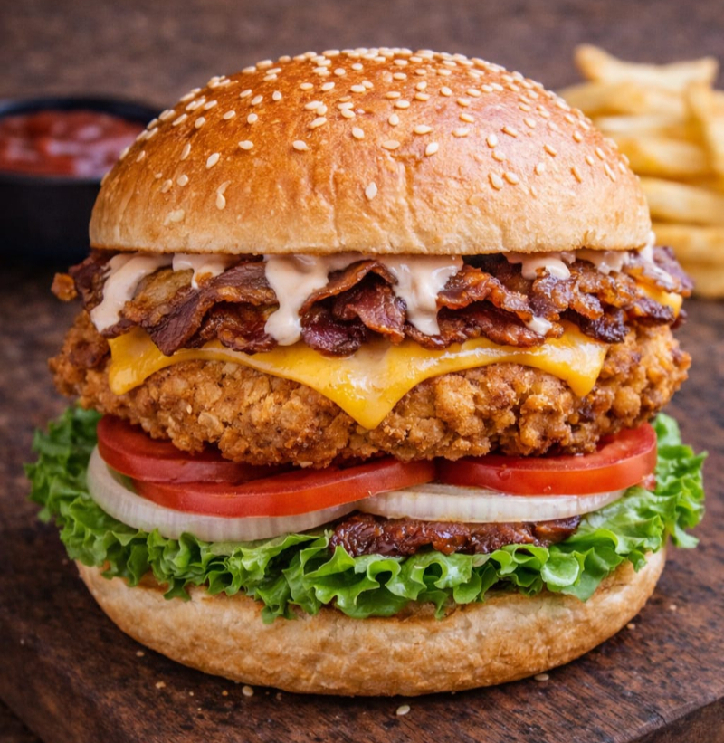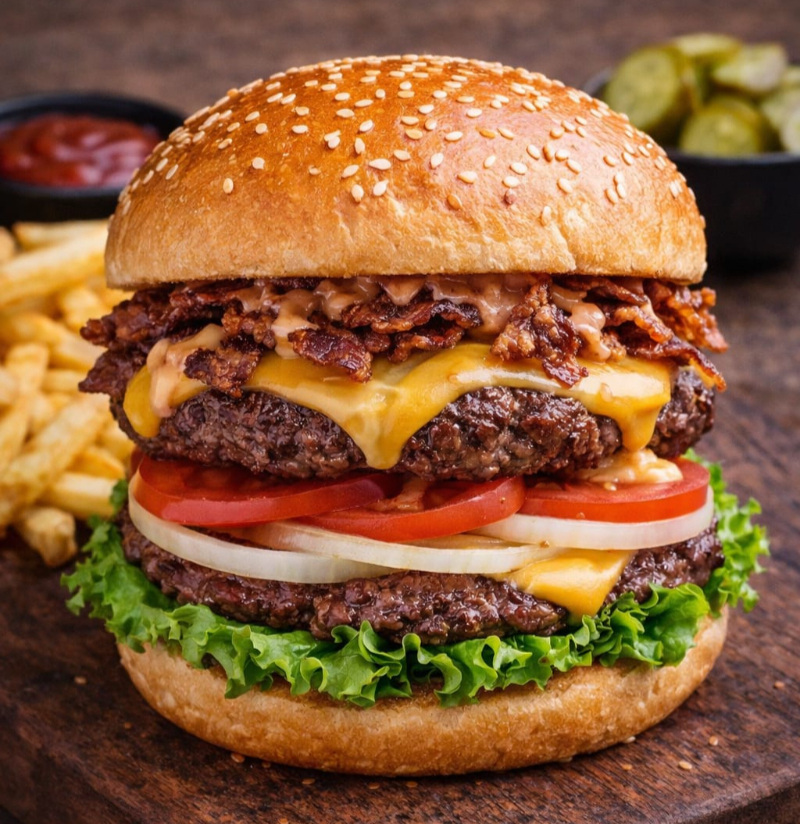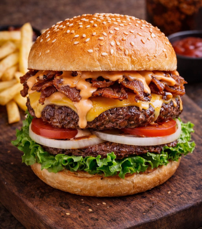 Jugosa carne de res con queso americano, queso manchego, tocino crujiente, verduras y papas fritas.