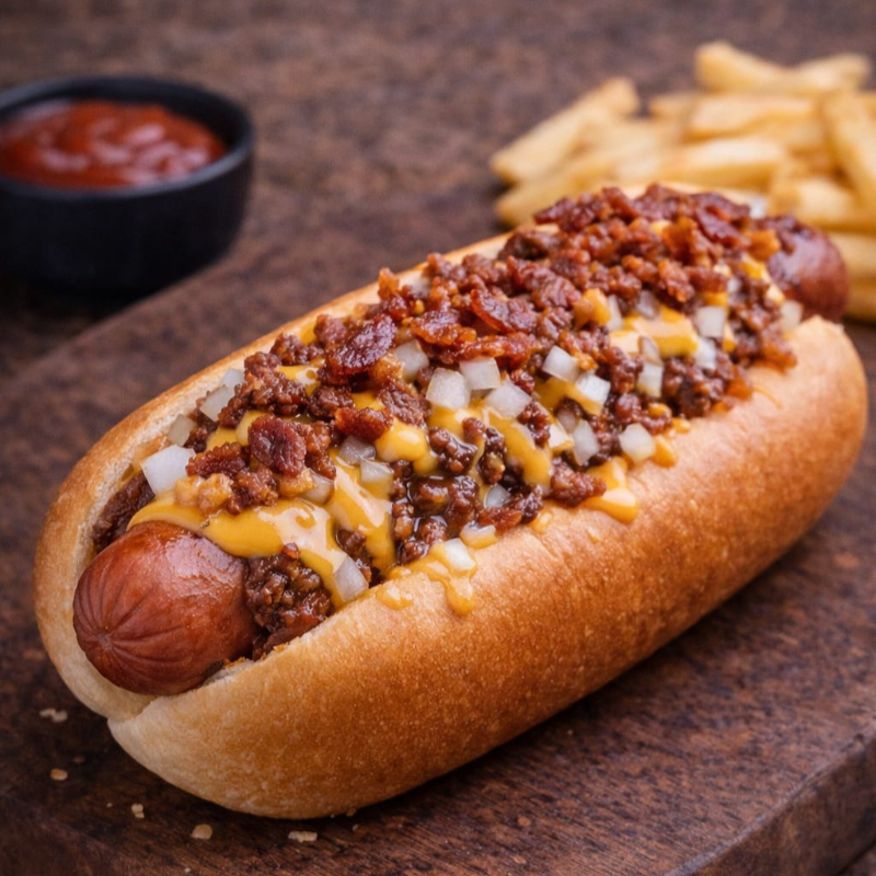 Hot dog preparado con salchicha, tocino, queso manchego, aguacate y cebolla asada.