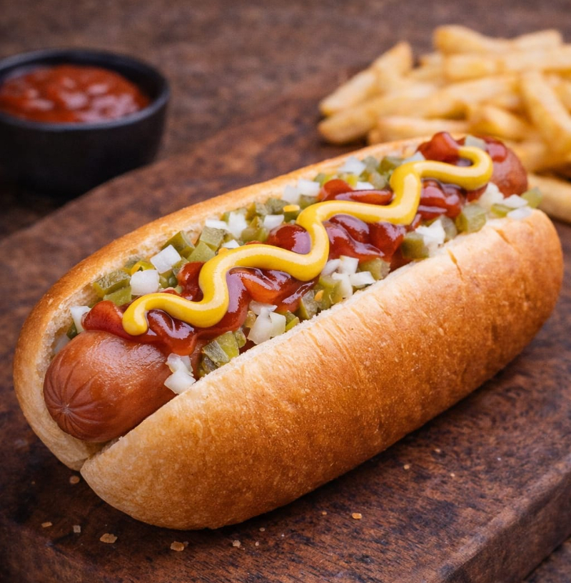 Clásico hot dog con salchicha, tomate, cebolla y chile.