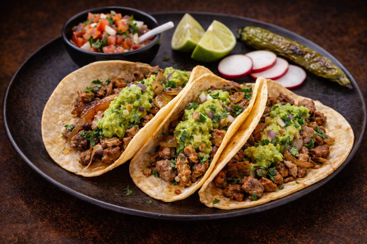 Tacos de carne asada en tortilla de maíz, acompañados de cebolla, cilantro, limón y salsa.