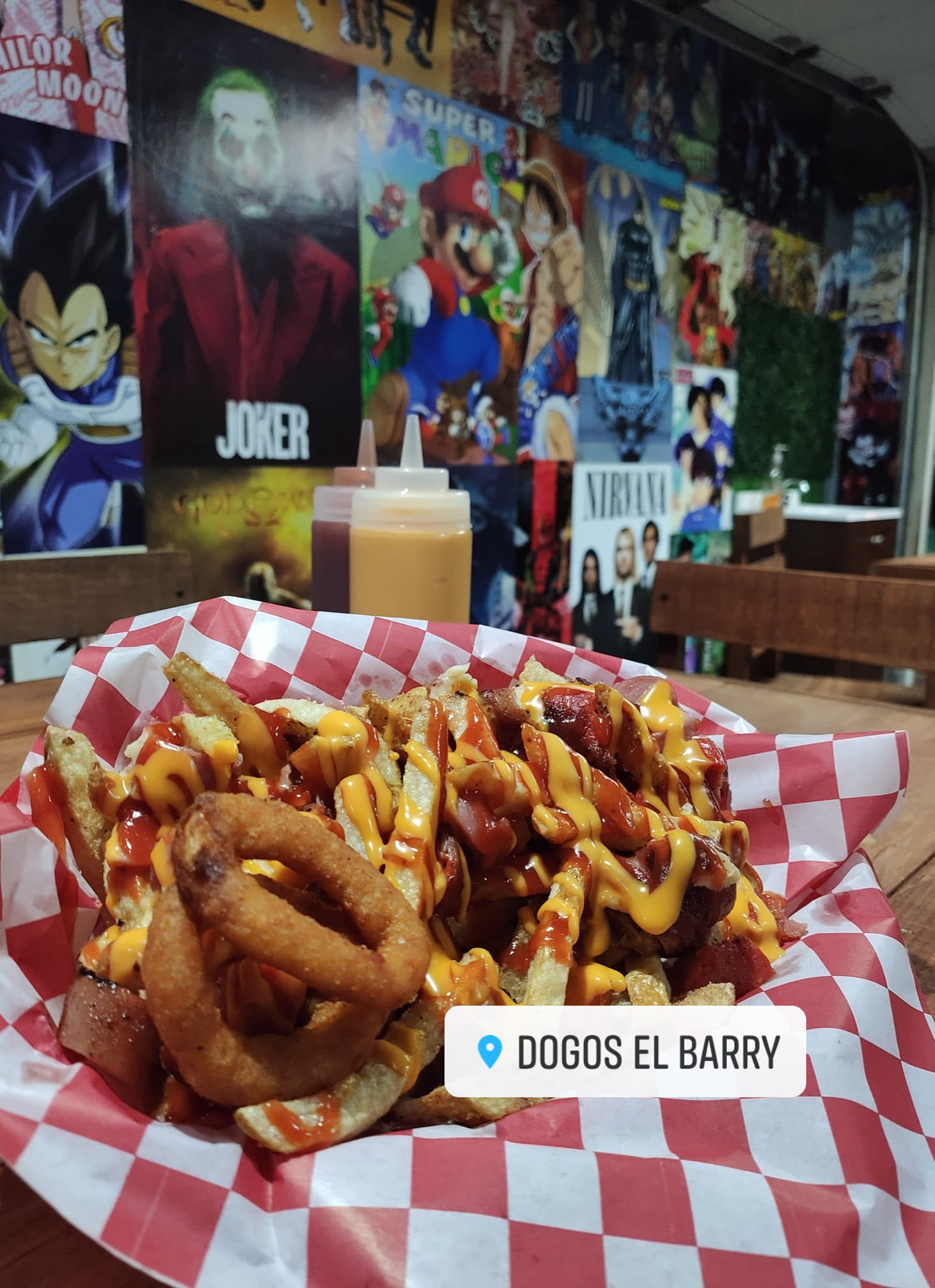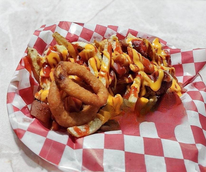 Salchicha, chile anaheim, jamón, queso Chihuahua y tocino, tomate, cebolla, cebolla asada, mayonesa, catsup, mostaza, queso amarillo, guacamole, papas y aros de cebolla.