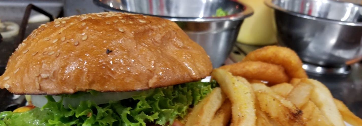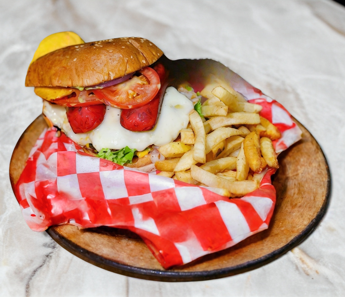 Carne de res al carbón, queso americano, chile jalapeño asado, cebolla asada y queso gratinado, cebolla, tomate, lechuga, cebolla asada, guacamole, catsup, mostaza, queso amarillo,, mayonesa, papas y aros de cebolla