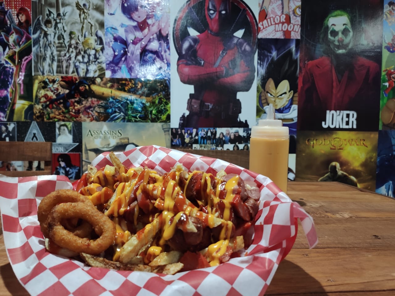 Salchicha, tocino, queso mozzarella gratinado, camarón, tomate, cebolla cruda, mayonesa, catsup, mostaza, queso amarillo, guacamole, papas y aros de cebolla.