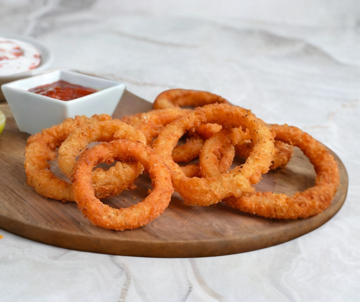 Boneless, papas y aros de cebolla,. 300 grs. de pollo