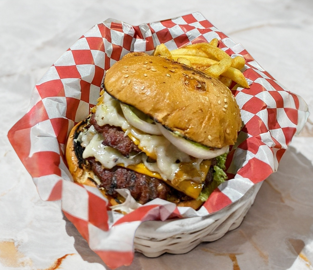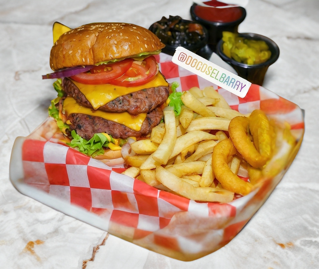 Dos piezas de carne de res al carbón, doble queso americano, cebolla, tomate, lechuga, cebolla asada, guacamole, catsup, mostaza, queso amarillo, mayonesa, papas y aros de cebolla