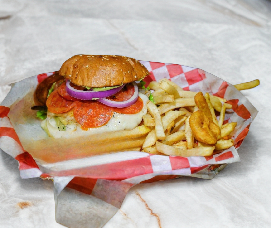 Carne de res al carbón, queso americano, queso gratinado, peperoni, cebolla, tomate, lechuga, cebolla asada, guacamole, catsup, mostaza, queso amarillo, mayonesa, papas y aros de cebolla