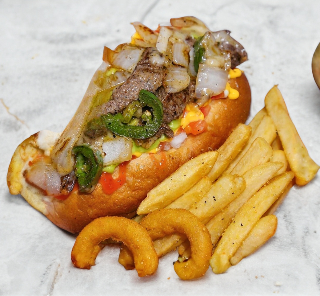 Salchicha de res jumbo, jalapeño asado, cebolla en cubos asada, queso mozzarella gratinado y carne asada, tomate, cebolla, cebolla asada, mayonesa, catsup, mostaza, queso amarillo, guacamole, papas y aros de cebolla.