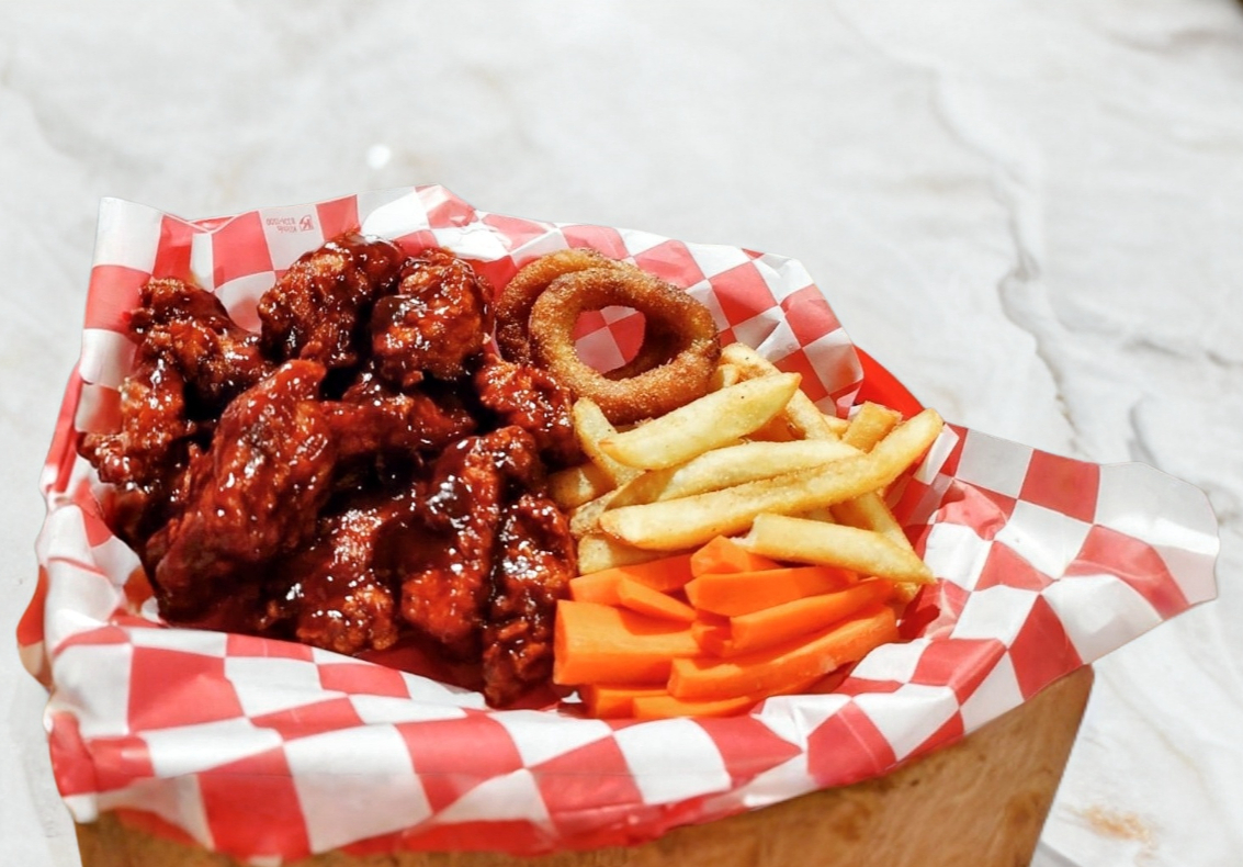 orden de alitas, papas y aros de cebolla.